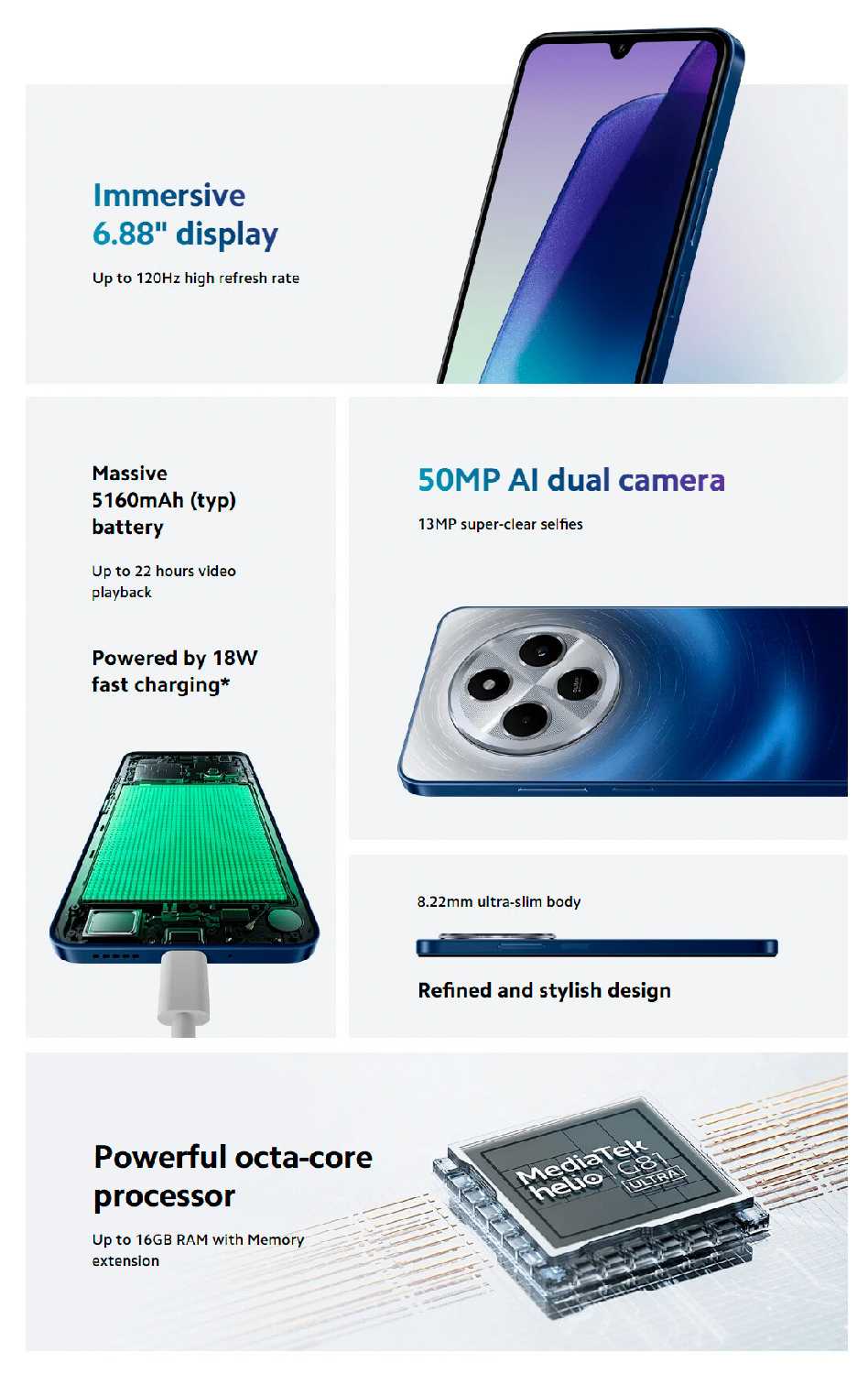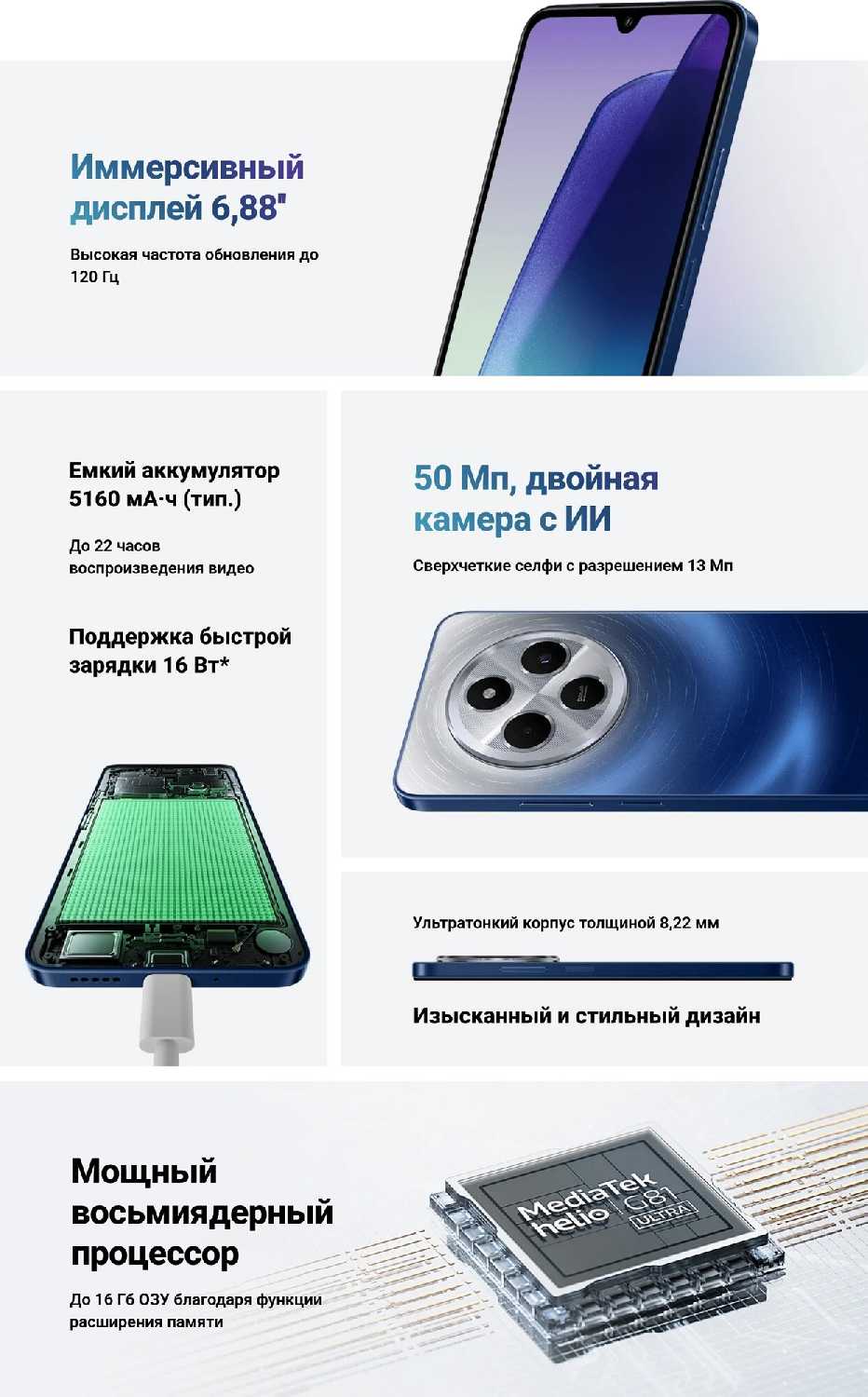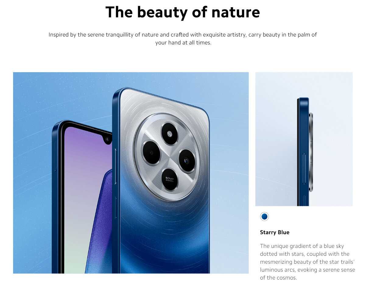 - Стильный дизайн с акцентным блоком камер и разнообразием цветовых решений (например, звездно-голубой) придает устройству премиальный вид.
