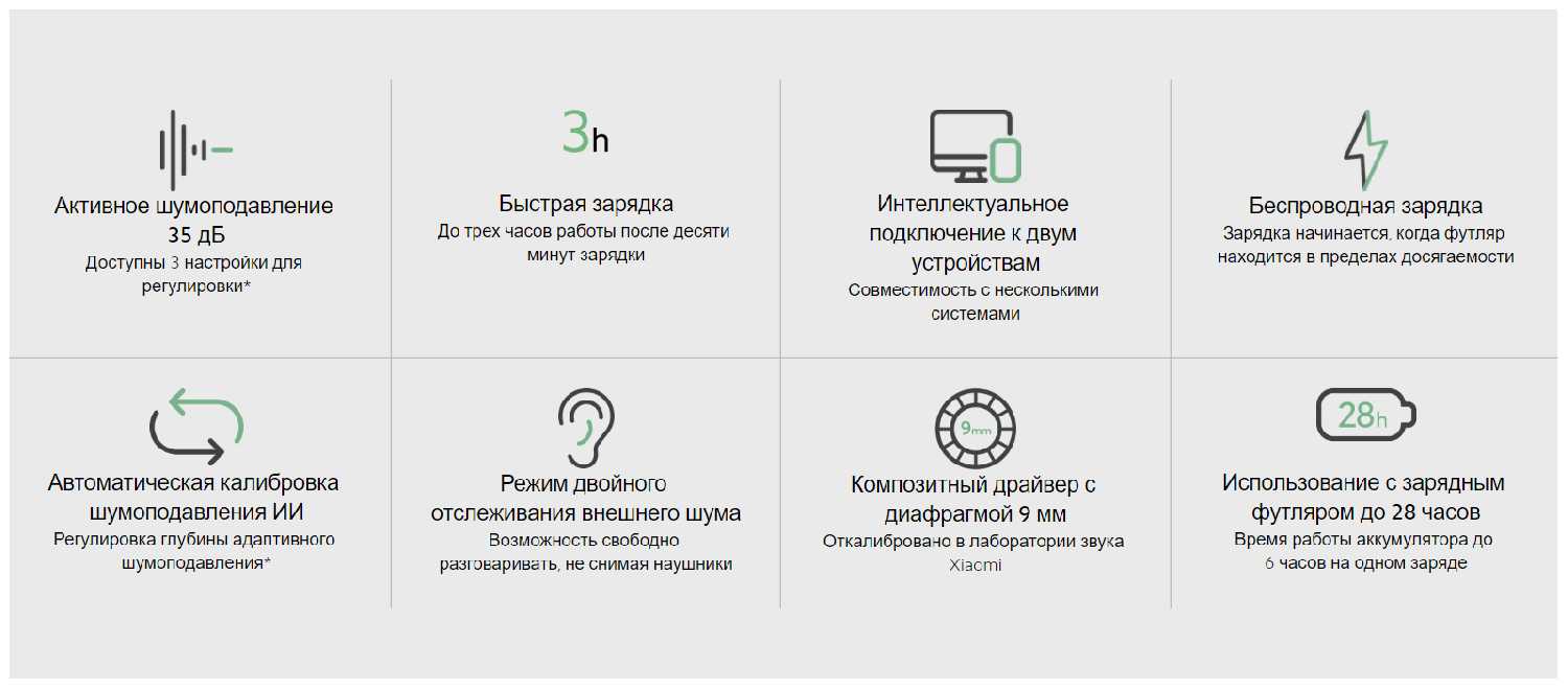 - Три уровня подавления шума настраиваются через приложение Mi Buds M8, что повышает гибкость использования.