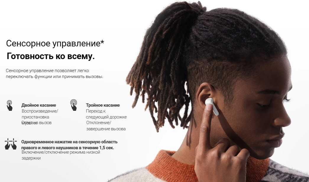 Сенсорные элементы реагируют на двойное и тройное касание (пауза/переключение трека), но могут случайно срабатывать при поправлении наушников в ухе. Некоторые пользователи отмечают необходимость привыкнуть к расположению сенсорной зоны. Отсутствие настройки жестов в стандартном приложении ограничивает кастомизацию. -