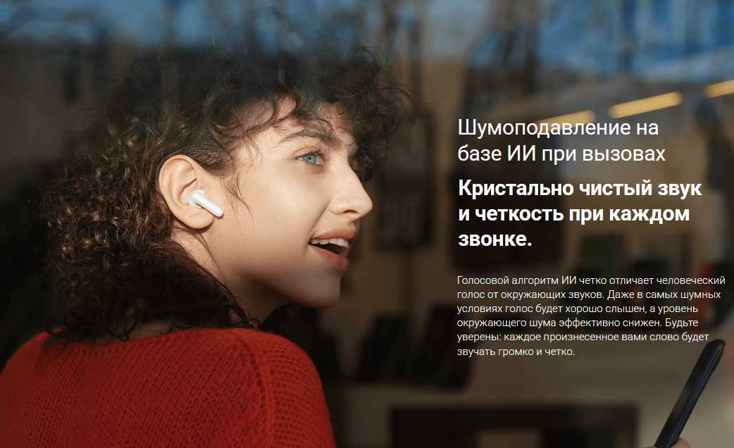 | Дополнительная информация : | радиус действия - 10м, 3 уровня активного шумоподавления (ANC) и адаптивный режим, алгоритм ИИ для шумоподавления, двойной режим прозрачности |