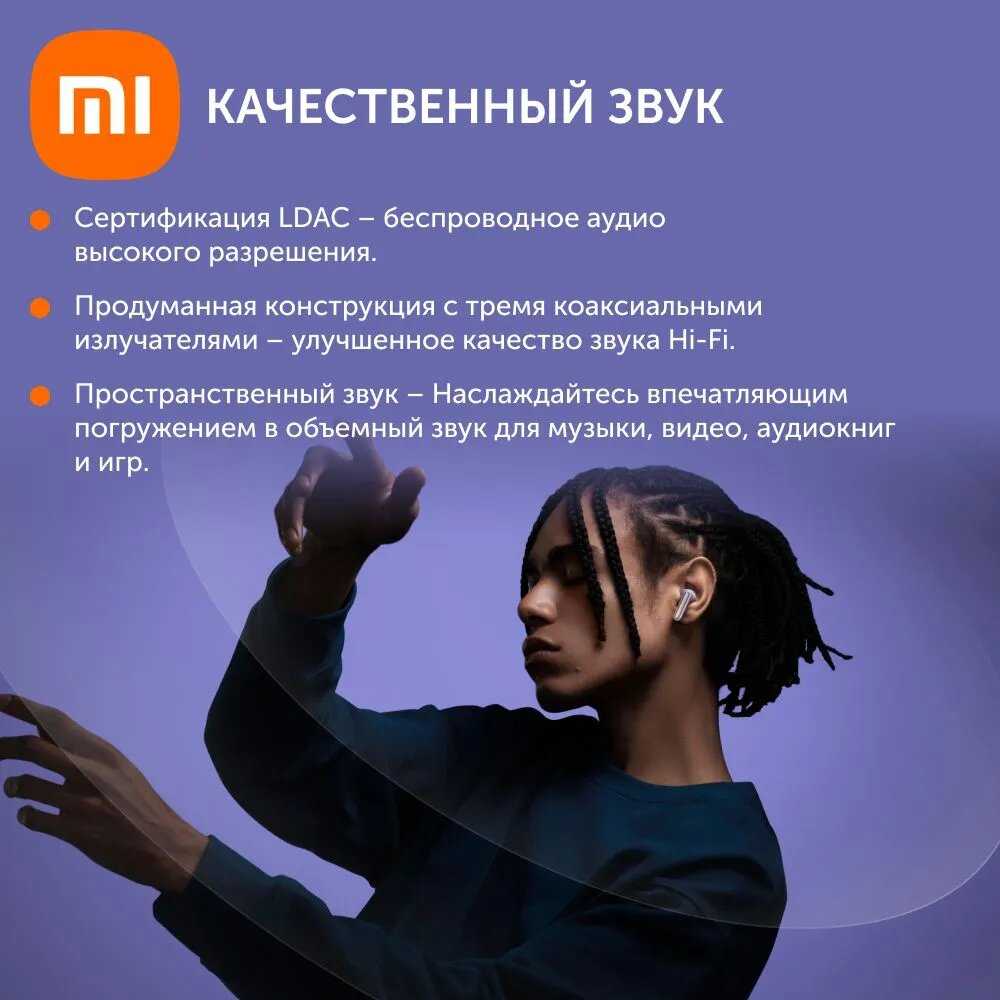 После тонкой настройки через фирменное приложение Xiaomi Earbuds (особенно эквалайзером и выбором региона "Материковый Китай") пользователи отмечают существенное улучшение звука: басы становятся глубокими, середина — чистой, а высокие частоты лишаются "свиста". Однако для раскрытия потенциала обязательна установка ПО и обновление прошивки — "из коробки" звук часто разочаровывает. Режим пространственного звучания с эффектом иммерсивности работает стабильно при активации через приложение. Кодек LDAC обеспечивает детализацию, но требует ручного переключения на AAC для корректной работы отслеживания головы. На максимальной громкости звук мощный, но возможны легкое шипение и артефакты при включенном ANC.