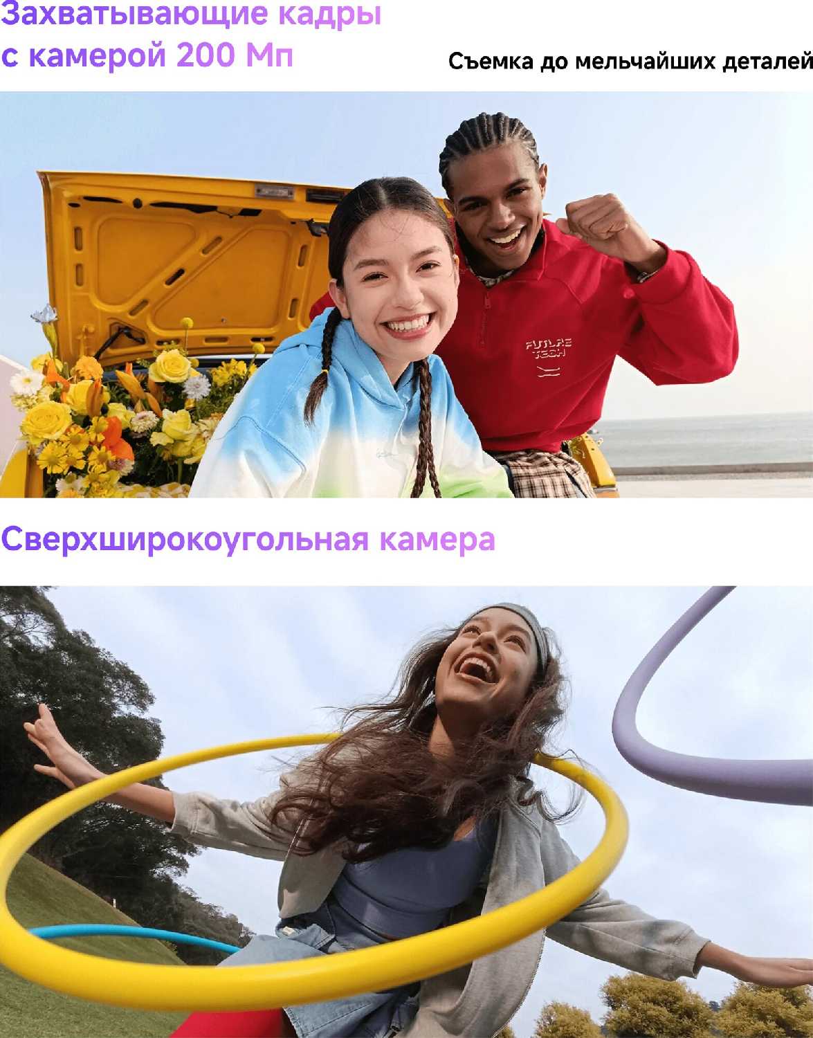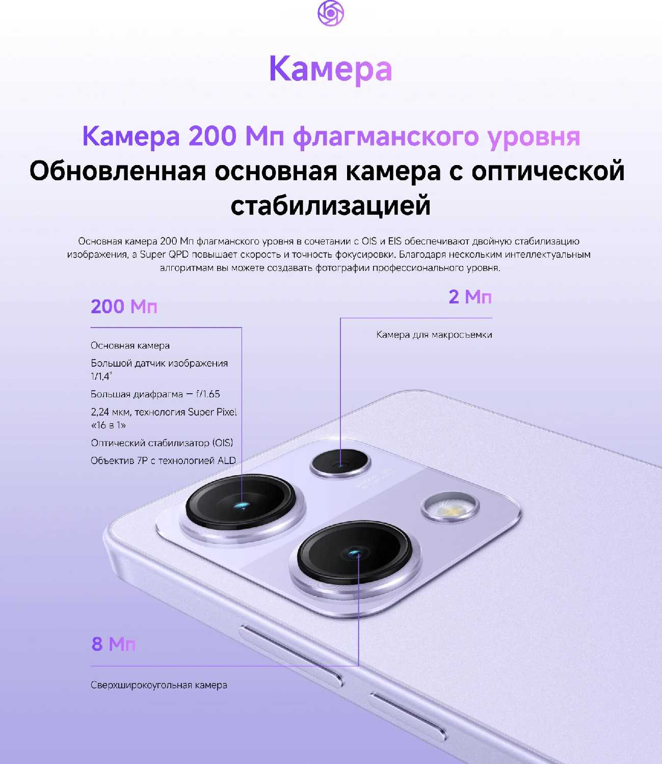 - Основной модуль 200 Мп с ИИ-обработкой обеспечивает детализированные снимки даже в движении.