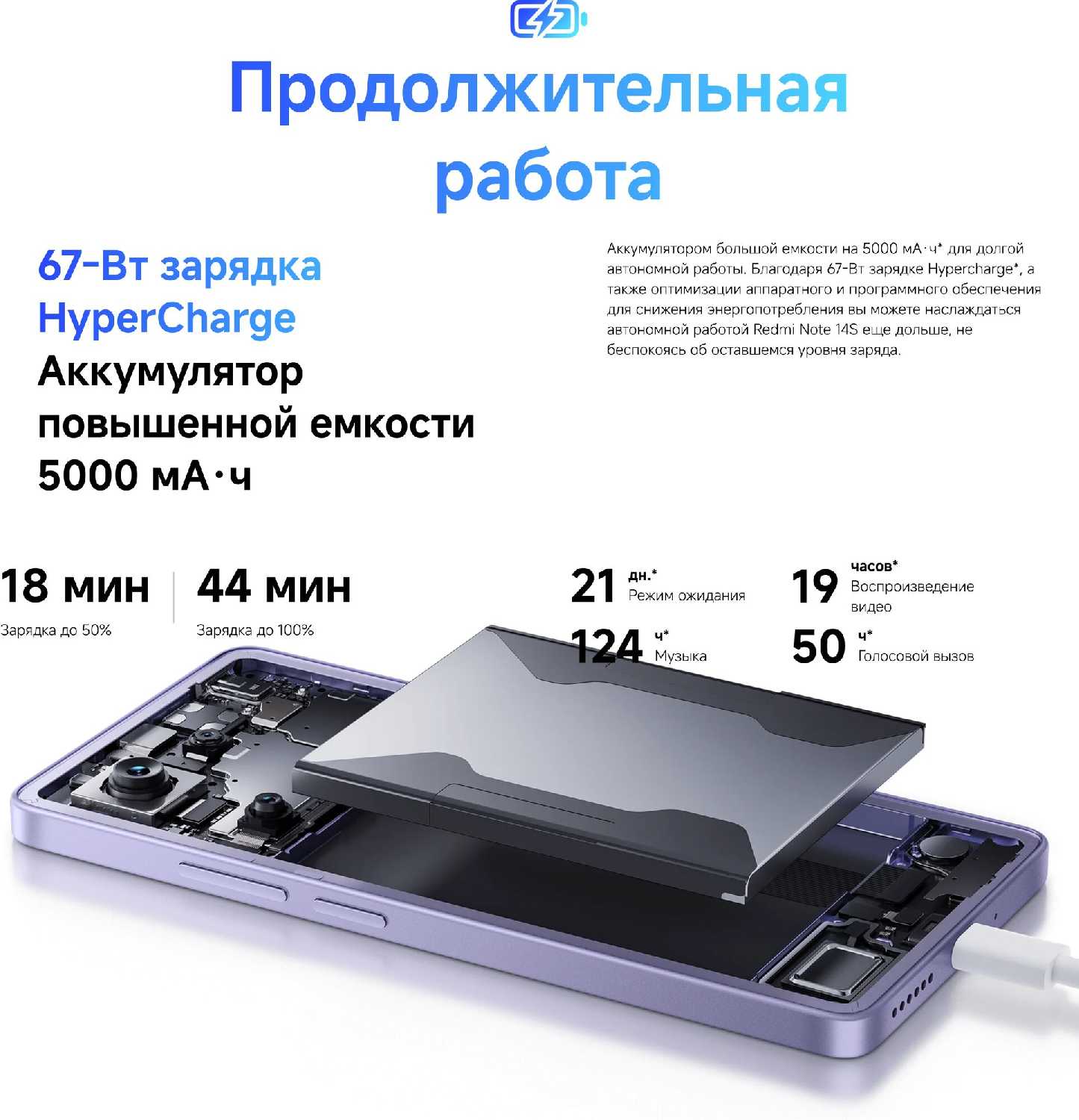 - Турбо-зарядка 67 Вт восстанавливает заряд с 0 до 100% за 40–50 минут, сокращая время простоя.