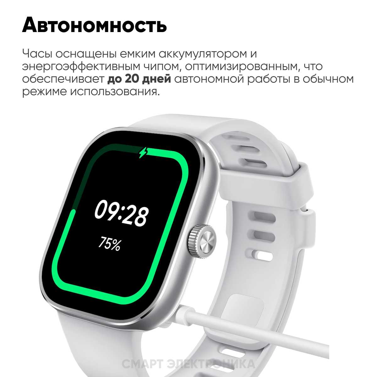 Дополнительная информация : | Длительное время работы, Увеличенный AMOLED дисплей 1.97″, Улучшенный мониторинг здоровья Тип аккумулятора встроенный, Работа от аккумулятора до 20 дней, Зарядка от USB порта, Водоустойчивый корпус, Голосовые вызовы по Bluetooth, Встроенный микрофон, Бег, Фитнес, Измерение пульса, Шагомер, Уровень кислорода в крови, Отслеживание сна, 1 в комплекте |