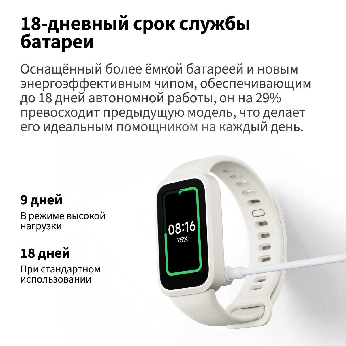 - Аккумулятор обеспечивает до 7-10 дней работы при умерен использовании с включенными уведомлениями и базовым мониторингом, что превосходит многие аналоги.