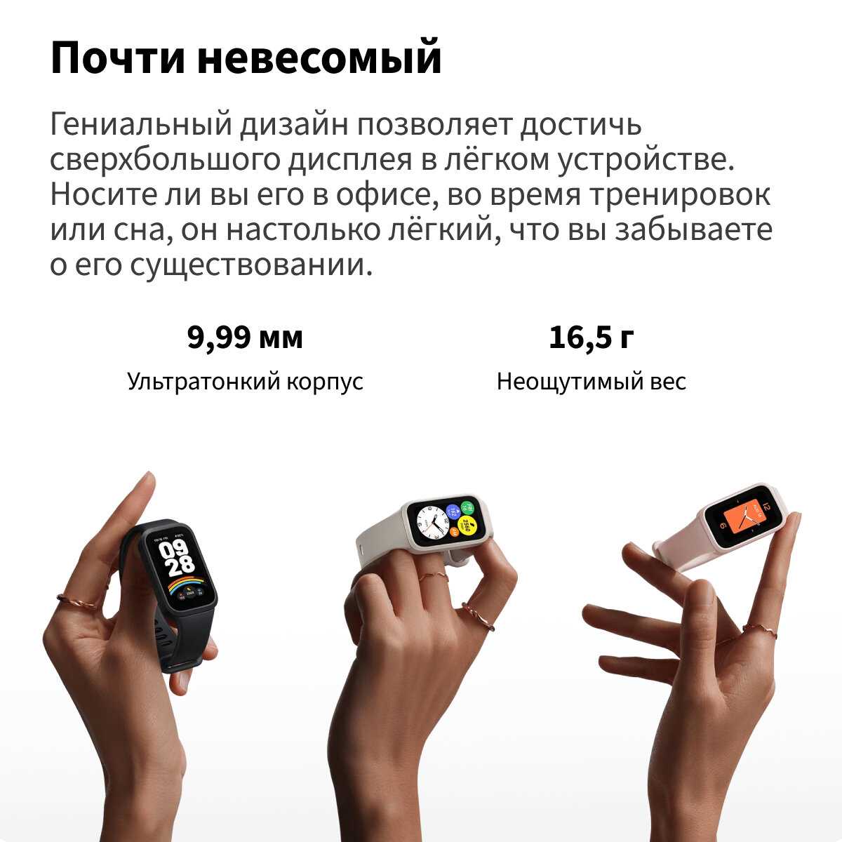 - Легкий вес (менее 25 г) и компактный корпус из металла и пластика не вызывают дискомфорта при круглосуточном ношении, включая сон.