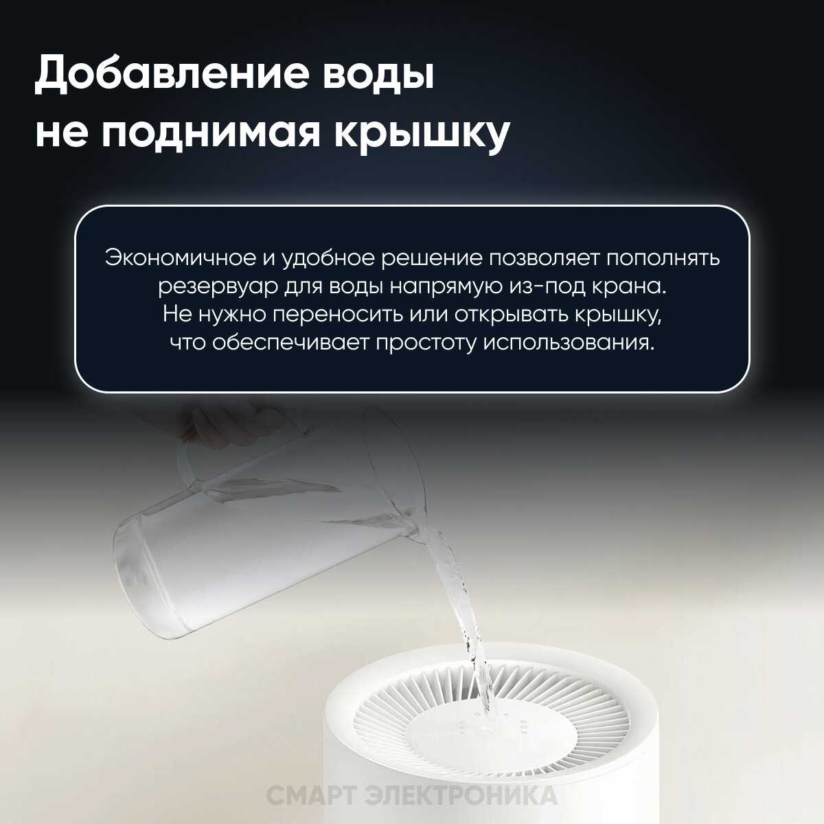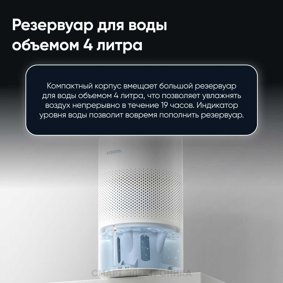 Устройство оснащено резервуаром объемом 4 литра, которого хватает примерно на 6-12 часов работы в зависимости от выбранного режима и текущей влажности в помещении. При интенсивном использовании в сухих условиях пользователям приходится доливать воду 1-2 раза в сутки. Удобство конструкции позволяет доливать воду сверху, не снимая крышку — достаточно поставить устройство на паузу с панели управления и добавить воду через верхнюю решетку. -