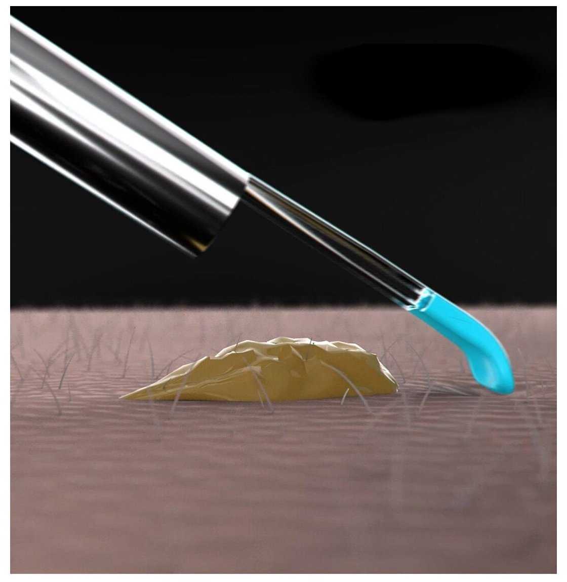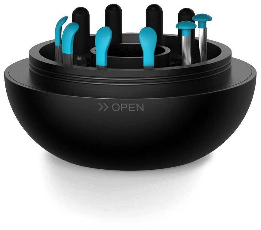 - 10 силиконовых насадок разной формы (лопатки, щетки) адаптированы для удаления серы без травм.