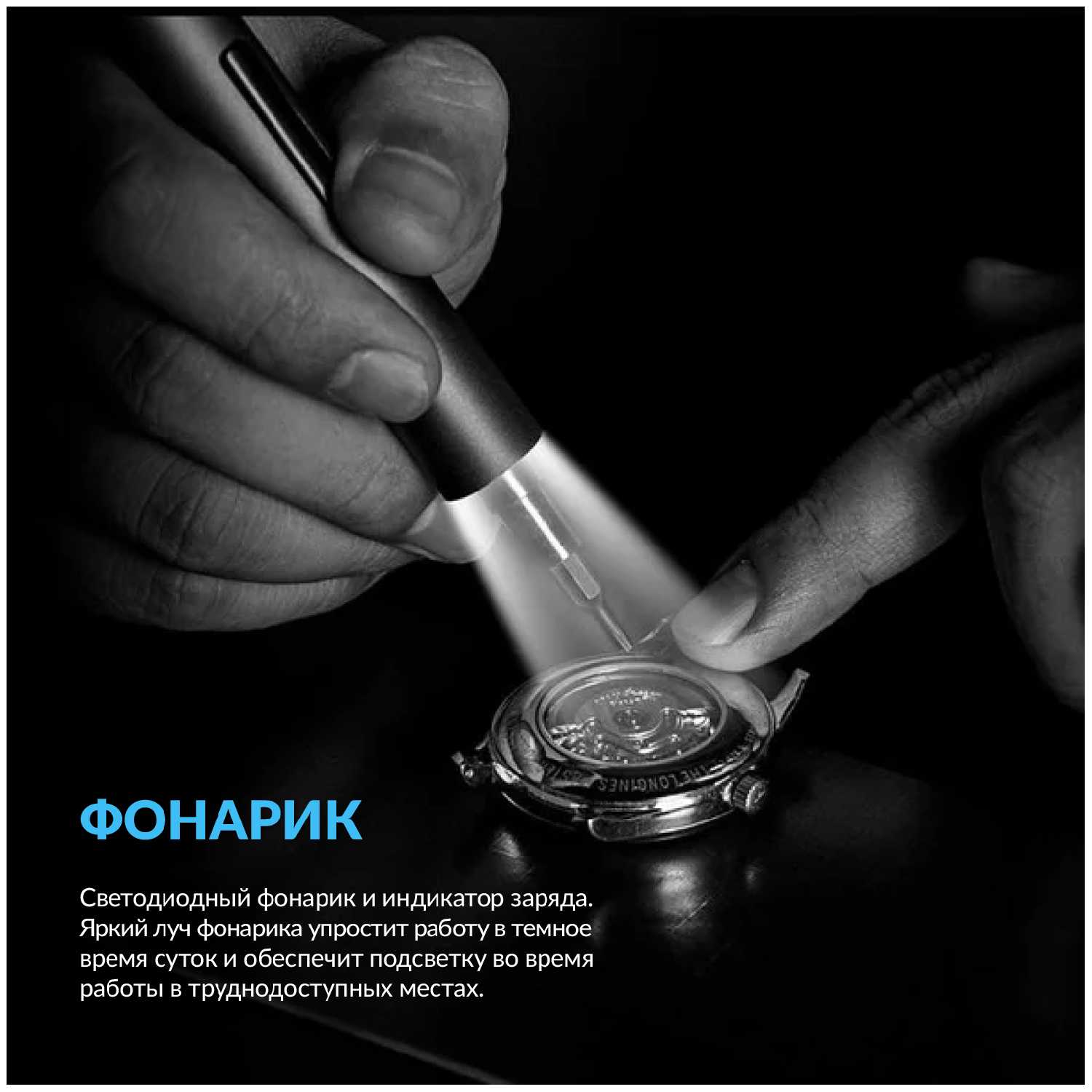 - Встроенный LED-фонарик с ярким освещением активируется при работе, упрощая работу в узких или затемнённых пространствах.