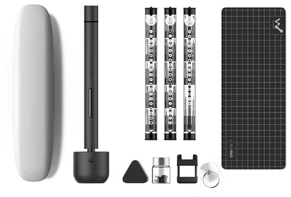 - Включены аксессуары: магнитный коврик для фиксации винтов, подставка, медиатор, присоска для экранов, баночка для крепежей.