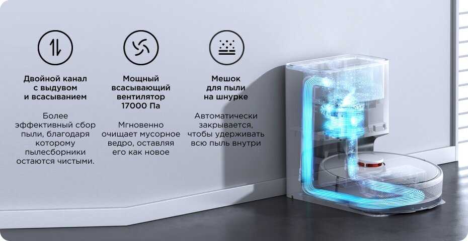 - После уборки робот автоматически выгружает мусор в герметичный мешок на базе, что минимизирует контакт с пылью.