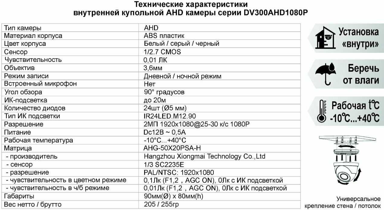 | Стандарт видеокамеры : | AHD, CVBS, HD-CVI, HD-TVI |