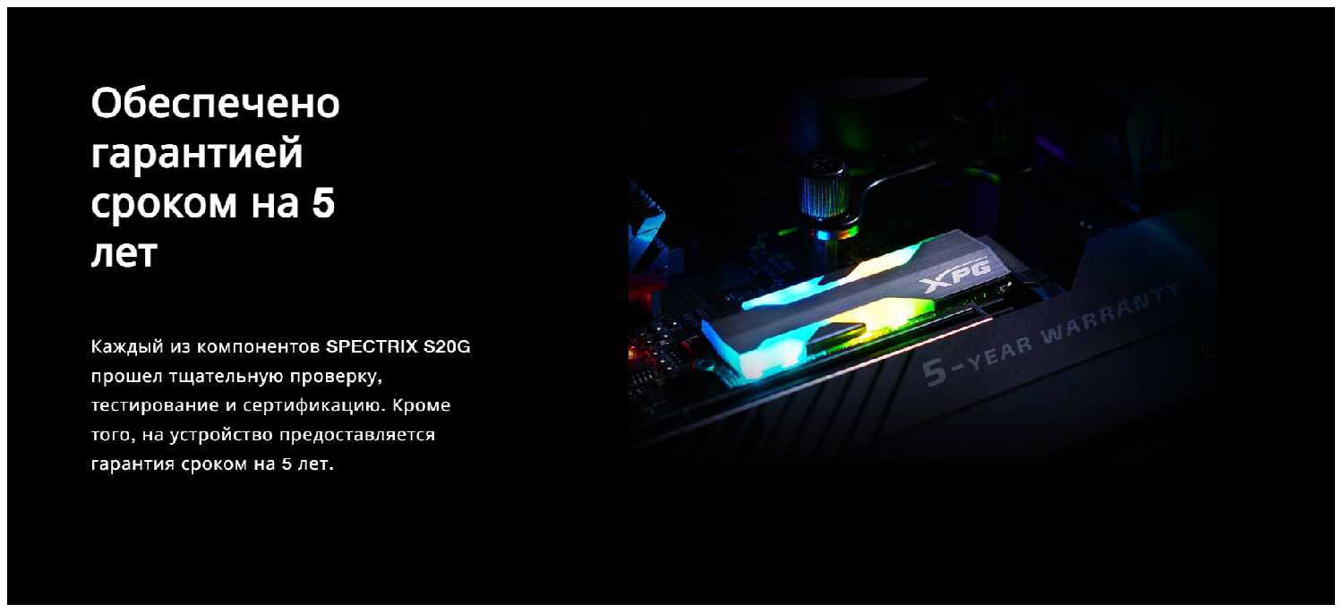 Подсветка реализована качественно и поддерживает синхронизацию с популярными системами управления: ASUS Aura Sync, Gigabyte RGB Fusion 2.0 и MSI Mystic Light. Производитель также предлагает собственную утилиту XPG для настройки цветовых эффектов. В стандартной конфигурации подсветка работает в режиме плавного переливания цветов, который устраивает большинство пользователей. Некоторые отмечают, что отключить подсветку через BIOS невозможно. -