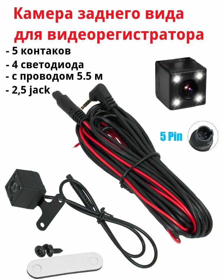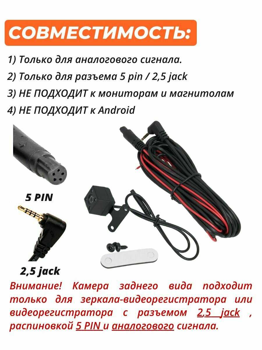 Брал для зеркала-видеорегистратора. У стандартной камеры провод погрязли мышки. Нашёл эту. Установил. Всё работает. Разъем 5 пин. Красный провод на + задних фонарей.