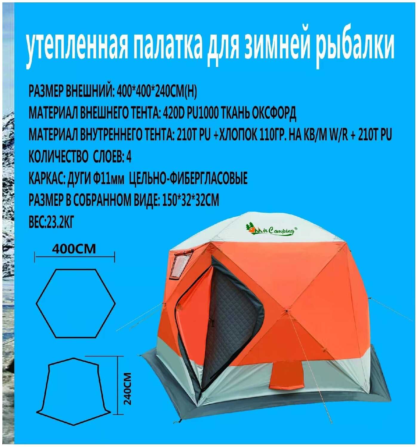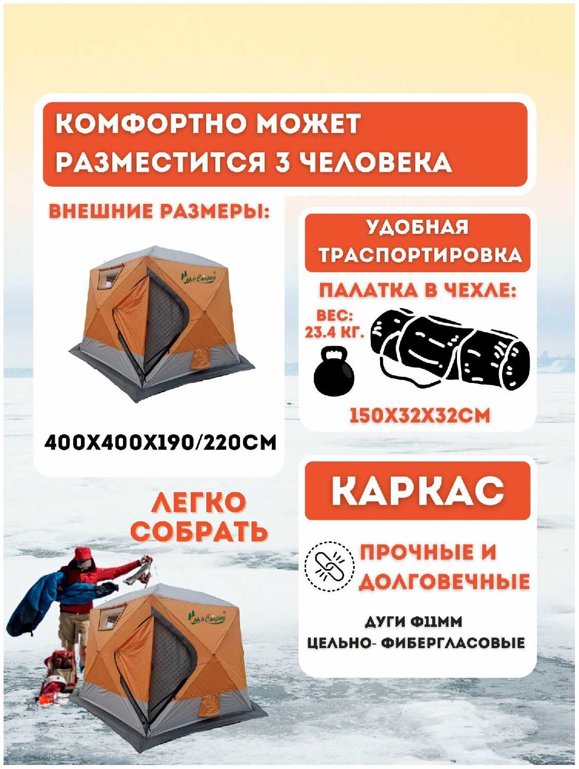 - + Отличная теплая палатка, очень вместительная. Тепло держит.