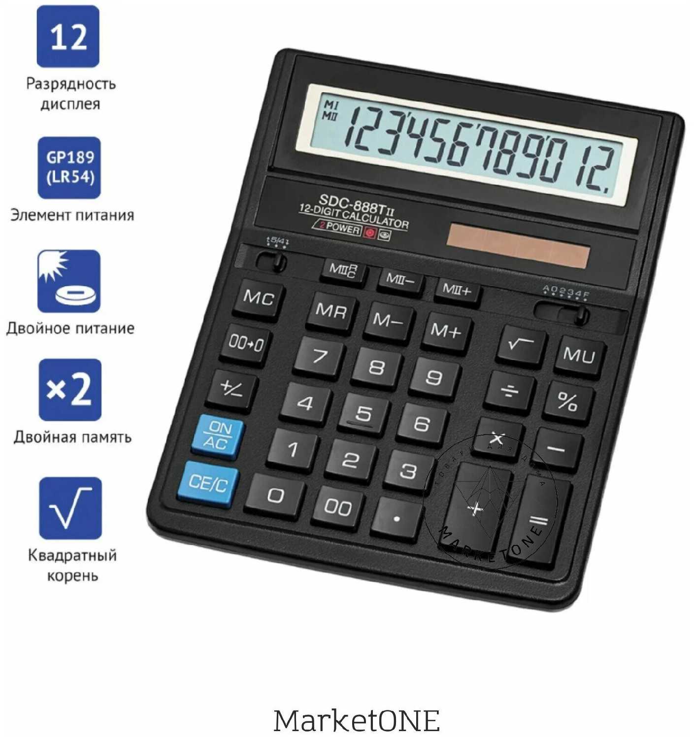 | Особенности : | автоматическое отключение питания, квадратный корень, клавиша "00", коррекция ввода, функция наценки |