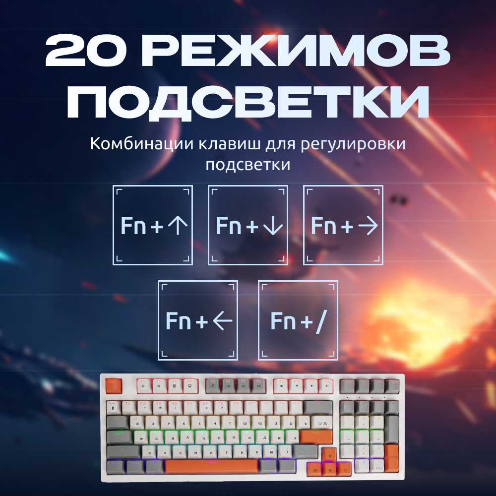 Клавиатура просто супер! 🔥 Белая, выглядит очень стильно. Подсветка яркая, можно менять цвета — красиво светится в темноте. Печатается приятно, белые свитчи мягкие и тихие, звук не раздражает. Подключается быстро — есть Type-C, Bluetooth и 2.4G, всё работает без задержек. Классно, что Hot-Swap — можно менять свитчи без пайки. В целом отличная игровая клавиатура за свои деньги! 💪✨