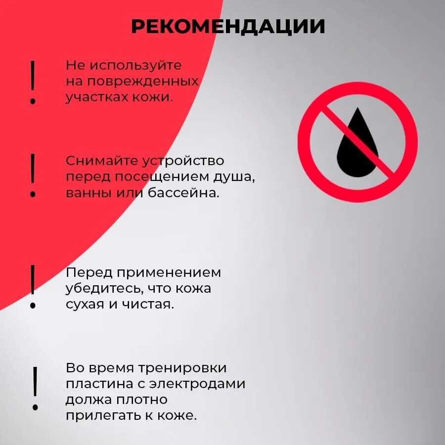- Для проработки всех групп мышц (пресс, ягодицы) необходимо отдельно докупать специализированные электродные пластины, что не входит в базовую комплектацию.