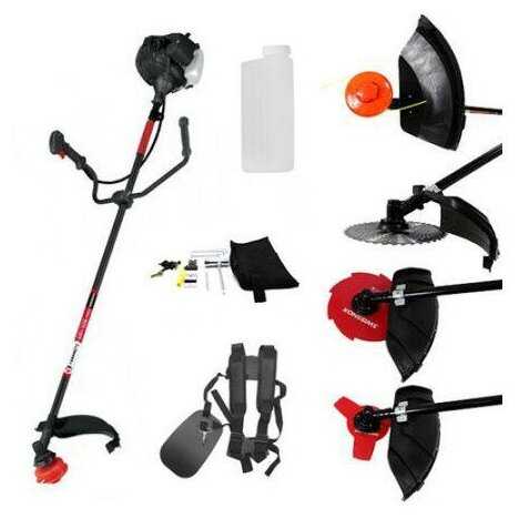 - Включает четыре насадки, диски, леску на катушке, ножи и удобные наплечники, что радует пользователей.