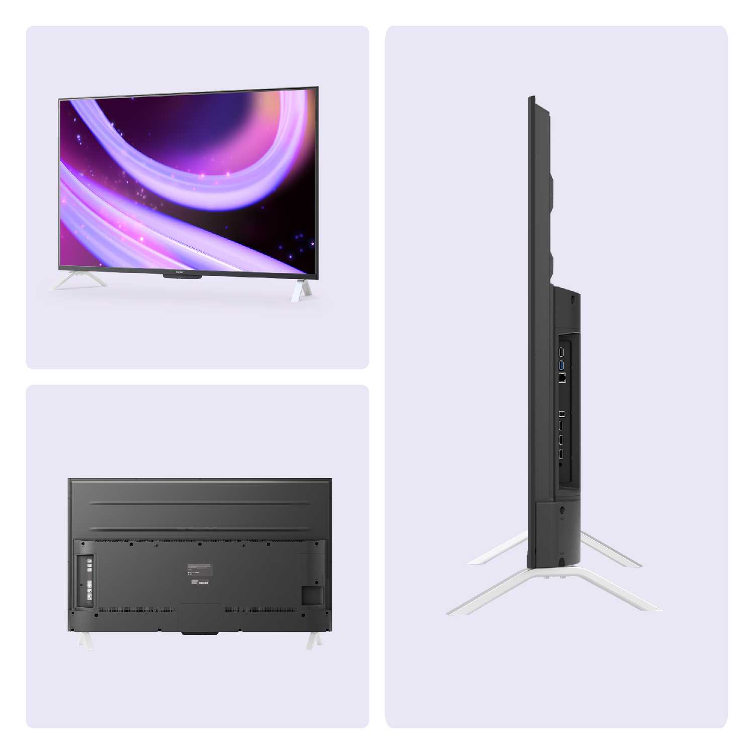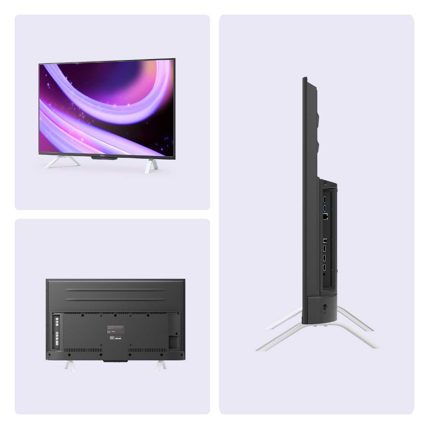 - Металлические ножки с резиновыми накладками обеспечивают устойчивость. Толщина корпуса — 84 мм, вес — 8.5 кг для 43-дюймовой модели.