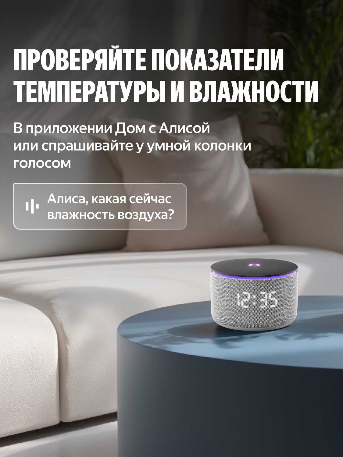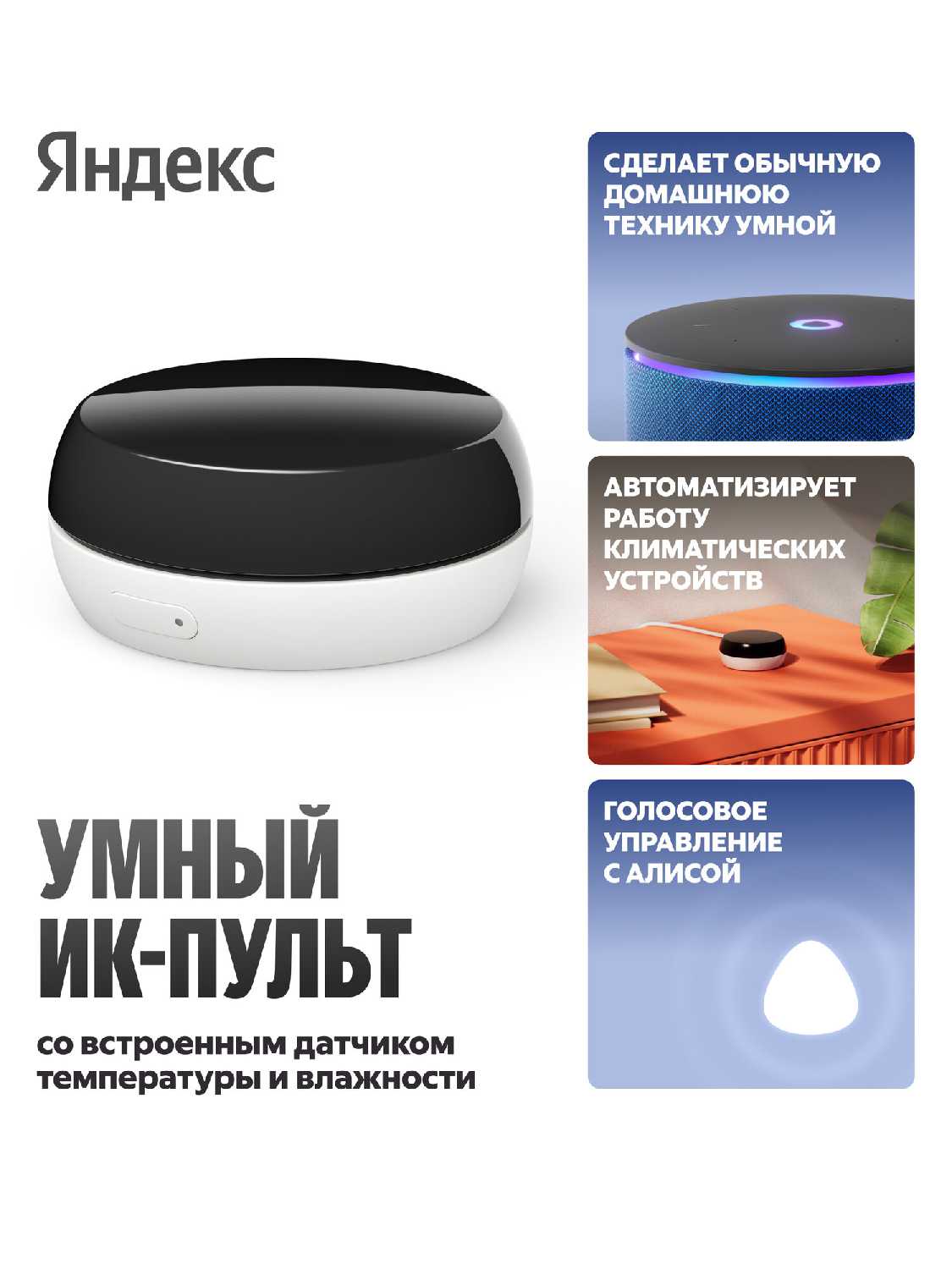 - + Включает и выключает телевизор и кондиционер. Можно настроить температуру воздуха голосом на кондиционере. Замеряет температуру и влажность в помещении.