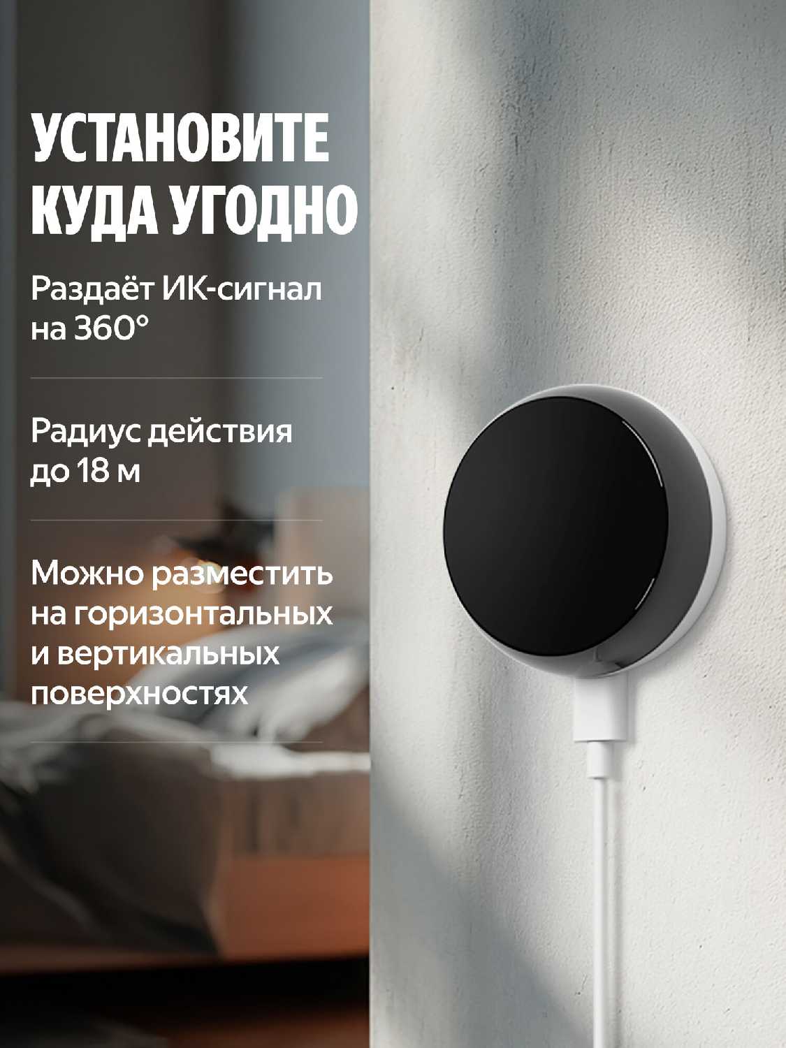 Да, миниатюрный (меньше предыдущей версии YNDX-005), с отверстием для стены, но USB-разъём снаружи – не прилегает вплотную. Короткий кабель и двусторонний скотч помогли бы; размещают у ТВ, роутера или на подставке. Симпатичный чёрный дизайн. -