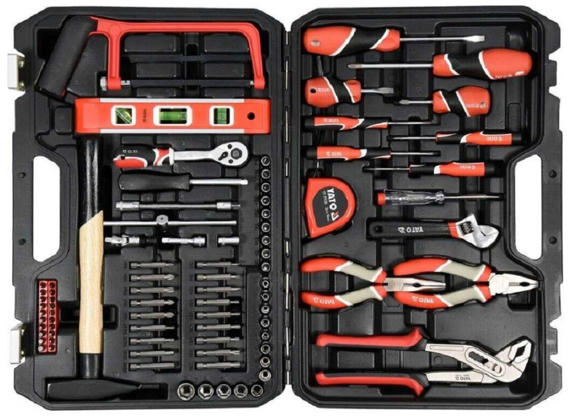 | Инструменты в комплекте : | бокорезы, вороток для головок, длинногубцы, клещи, клещи для снятия изоляции, клещи переставные, ключ разводной, ключи гаечные, ключи имбусовые (шестигранные), ключи торцевые, кусачки, молоток, ножовка по дереву, отвёртки, пассатижи, паяльник, плоскогубцы, рукоять для бит, рукоять для головок, тонкогубцы, трещотка |