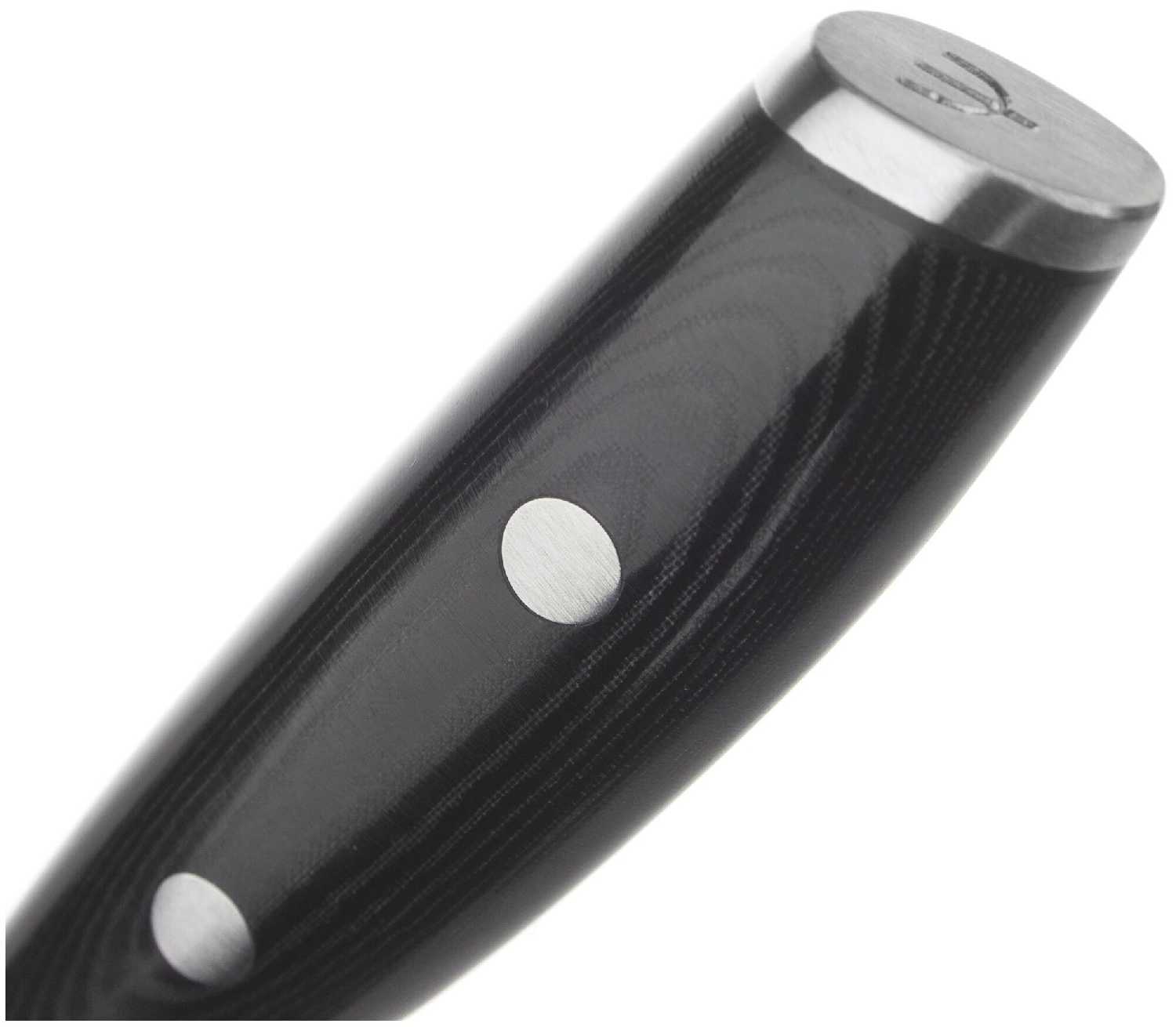 - + Качественный японский нож. Удобный для ежедневного использования на кухне. Удобен в женской руке.