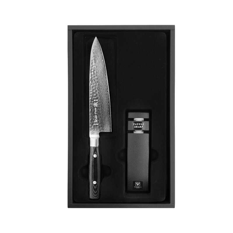 | Подробная комплектация : | Набор, из кухонного ножа с точилкой, серия ZEN (37 слоев), дамасская сталь, Yaxell, Япония В набор входят: 1. Нож кухонный Шеф 20 см 2. Точилка для ножей |