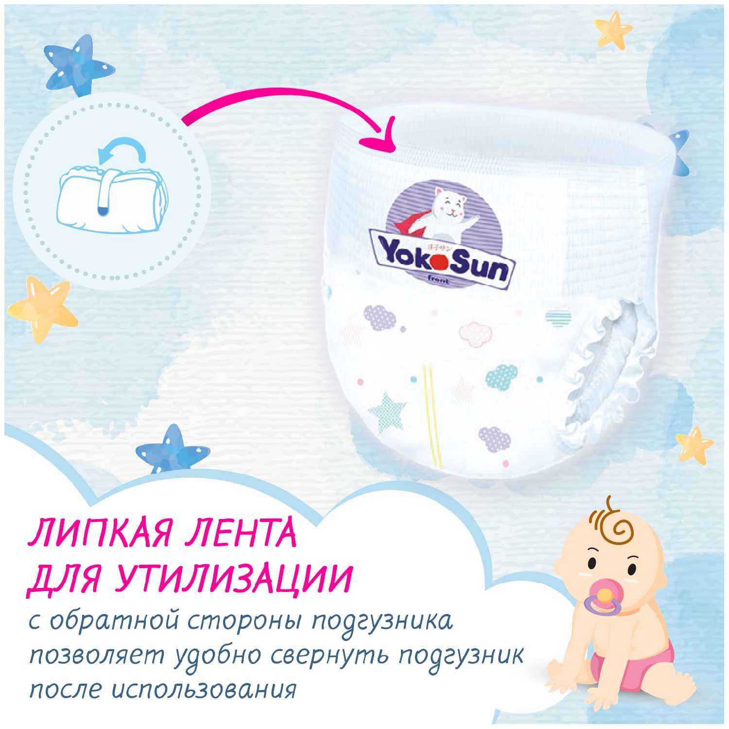 - Использованный подгузник сворачивается в компактную форму благодаря широкой клейкой ленте, что упрощает утилизацию.