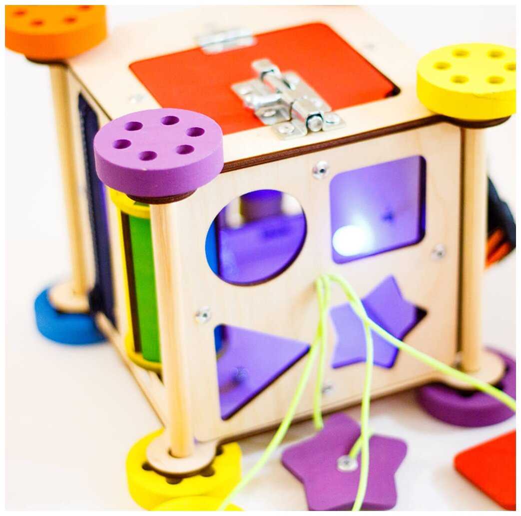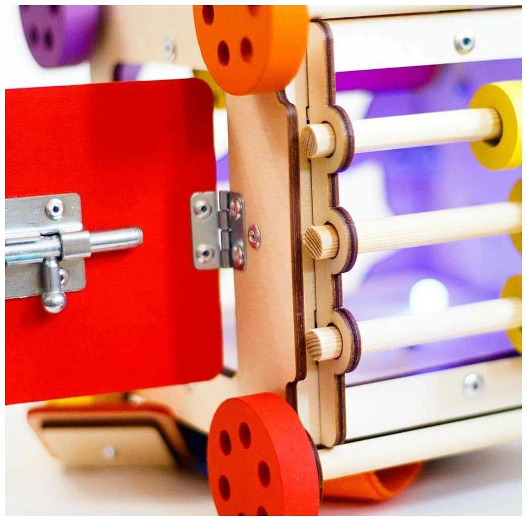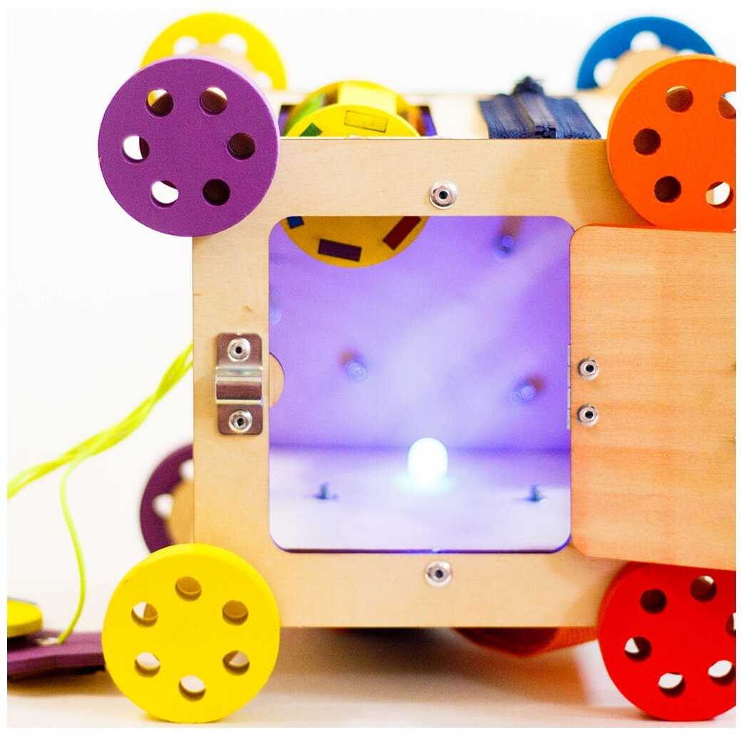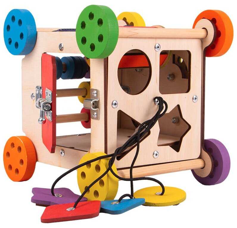 Комплектация : | Наполнение: 1-я сторона: геометрический сортер, 2-я сторона: дверца с шпингалетом, 3-я сторона: счеты, 4-я сторона: музыкальный барабан и молния, 5-я сторона: шестеренки, 6-я сторона: стропа с фастексом и включатель света. |