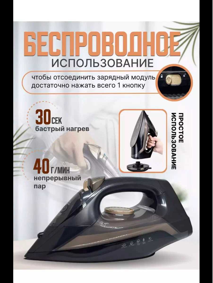 Очень удобный в использовании беспроводной утюг, теперь к розетке больше не привязана. Мощный, быстрый в нагреве, не прилипает к тканям. Все функции есть, в том числе вертикального отпаривания. Не оставляет капель и следов на одежде. Хорошая покупка.