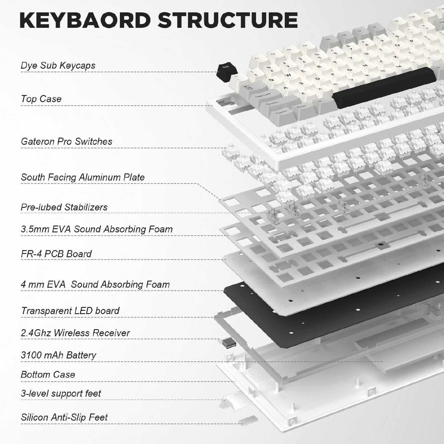 В комплекте есть несколько дополнительных кейкапов серого и белого цветов, если захочется поменять черные, кабель usb-type-с, 2.4G приемник для подключения к устройствам без Bluetooth-адаптеров, инструмент для снятия кейкалов и свитчей, пара запасных свитчей.