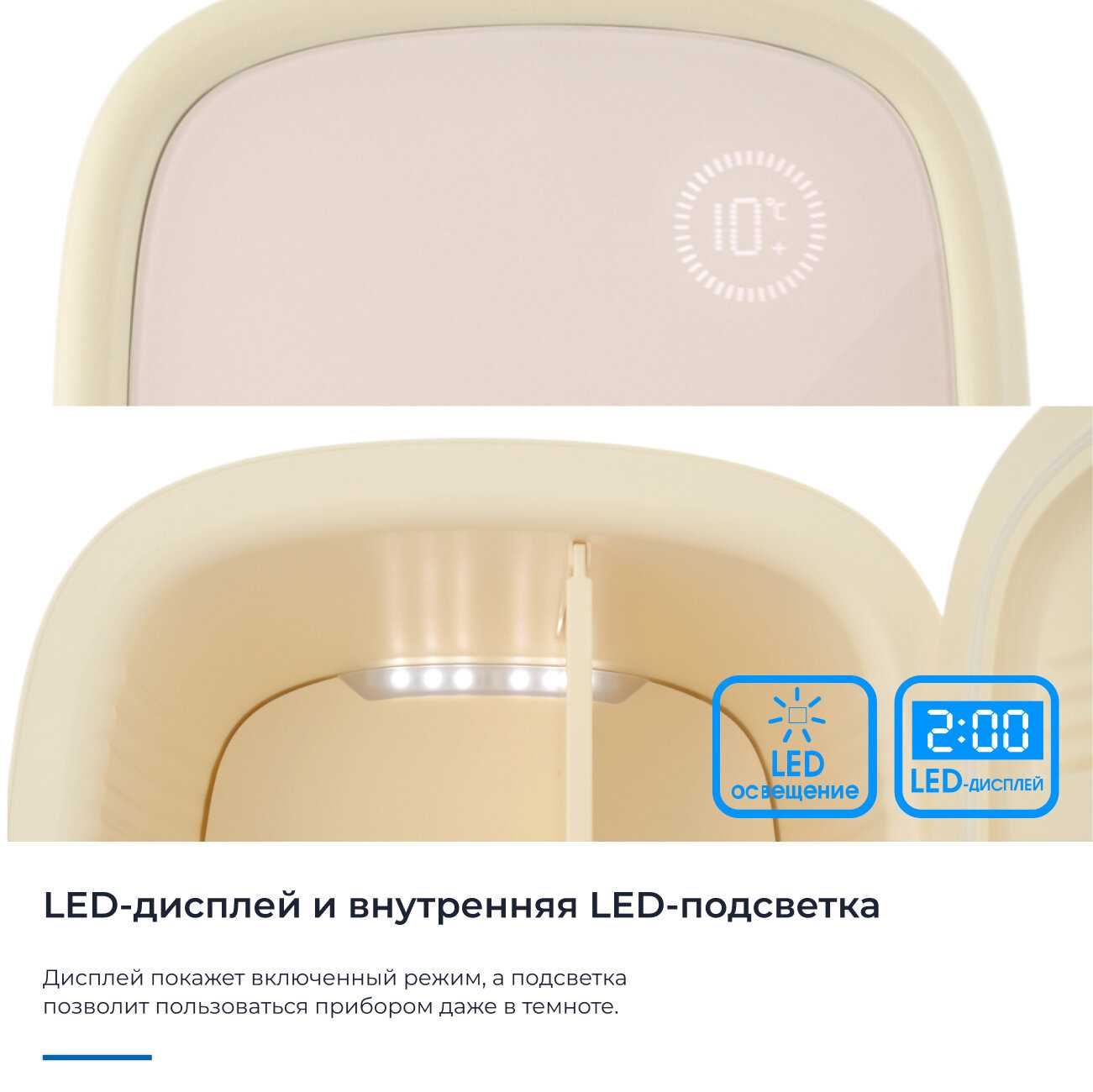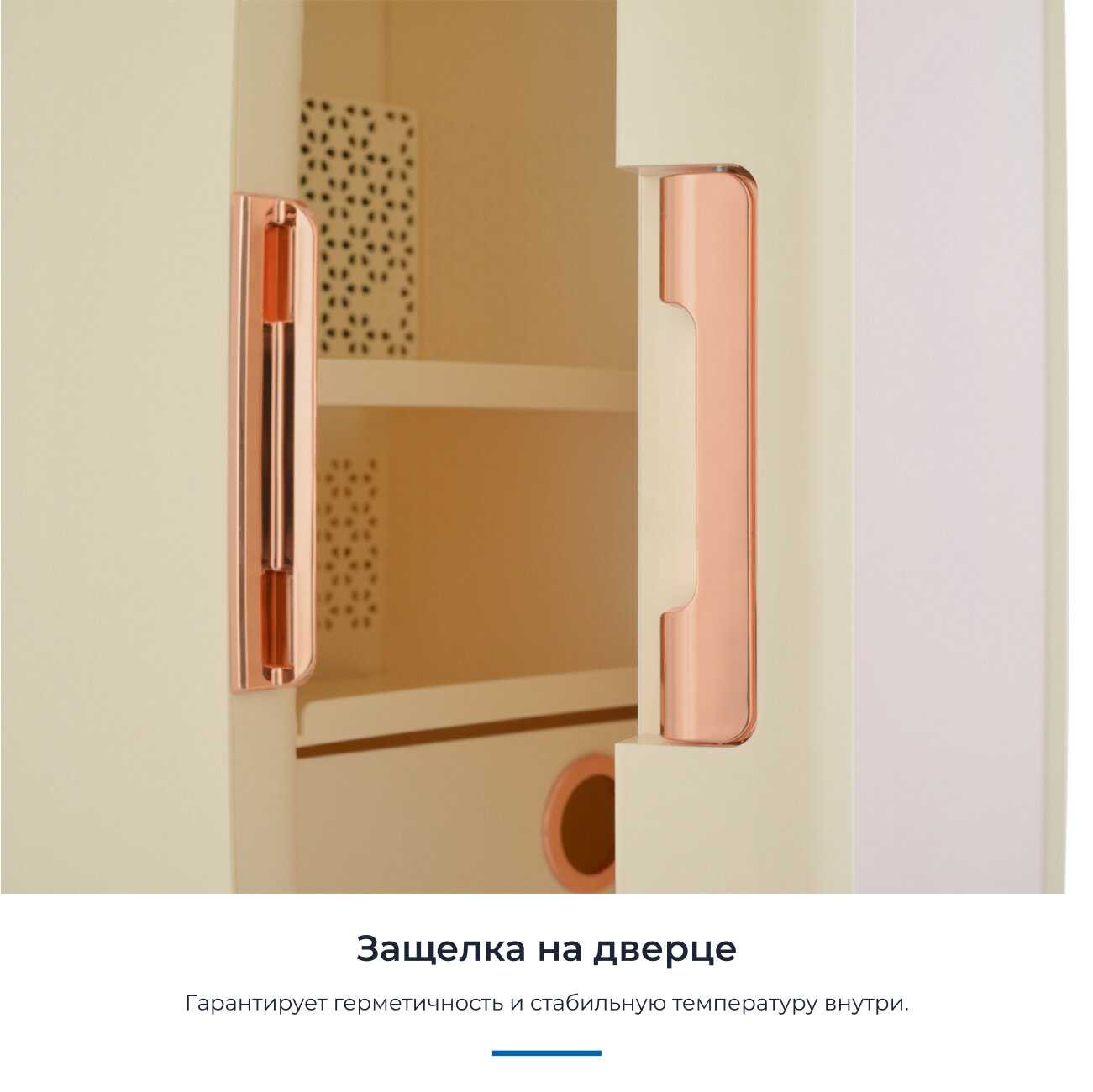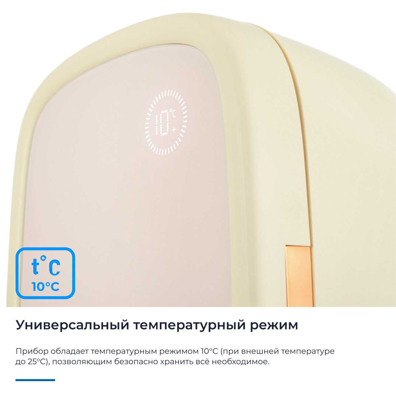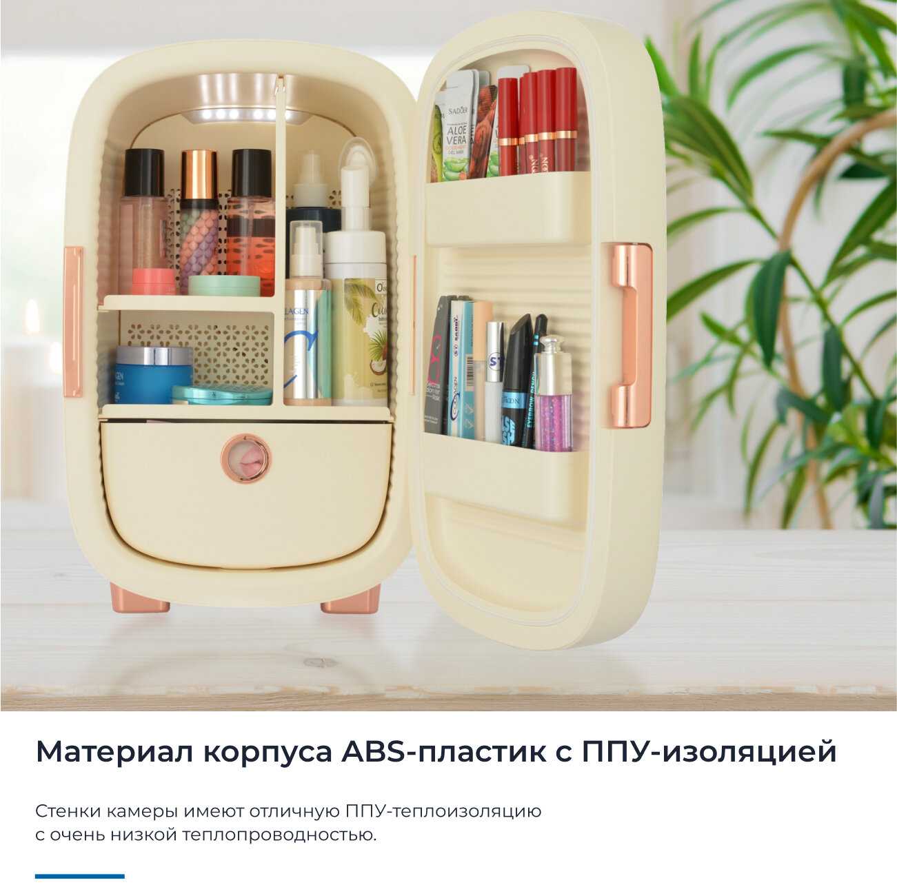 Этот кремовый малыш — просто восторг! Увидела у коллеги на съёмке и на следующий день уже забрала свой. Сюда помещаются все мои баночки: патчи, сыворотки, роллеры — всё охлаждается ровно и бережно. Работает почти бесшумно, держит 10°C стабильно. Подсветка — мягкая, не режет глаза ночью, когда ищу патчи на сонной автоматике.