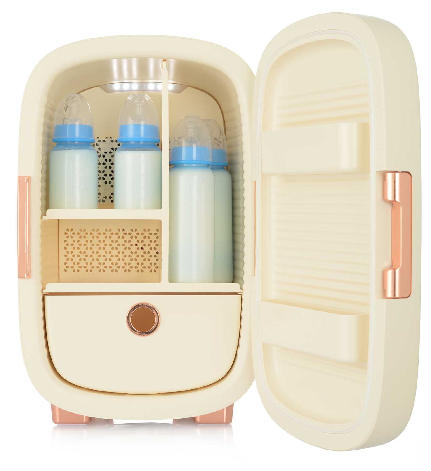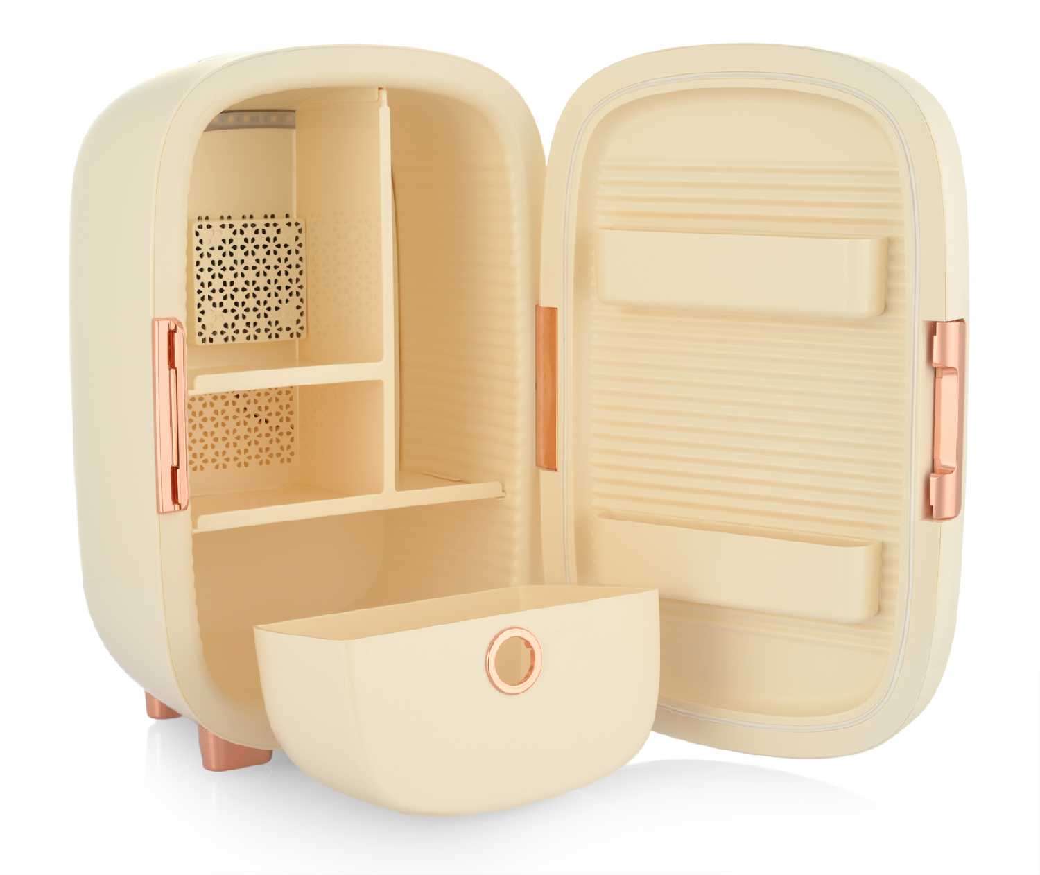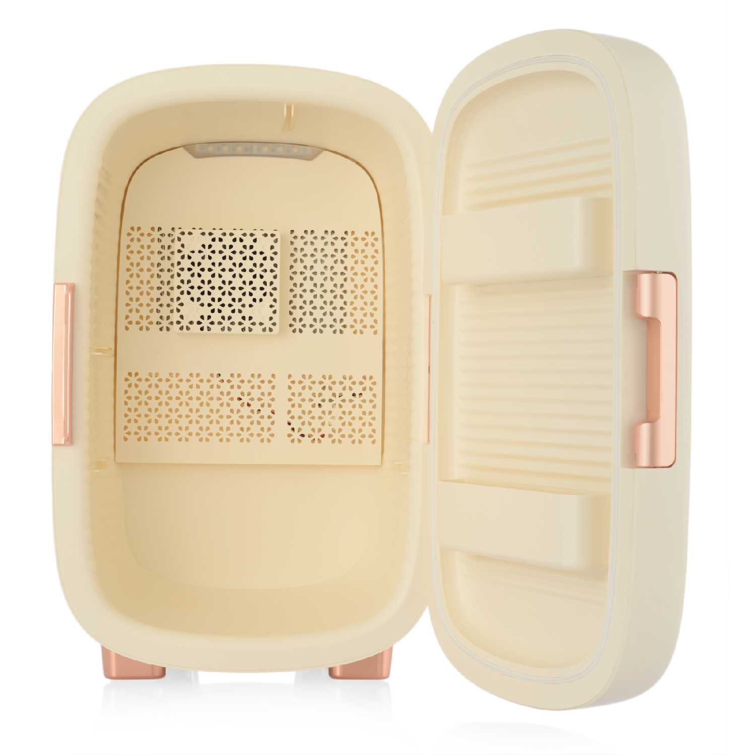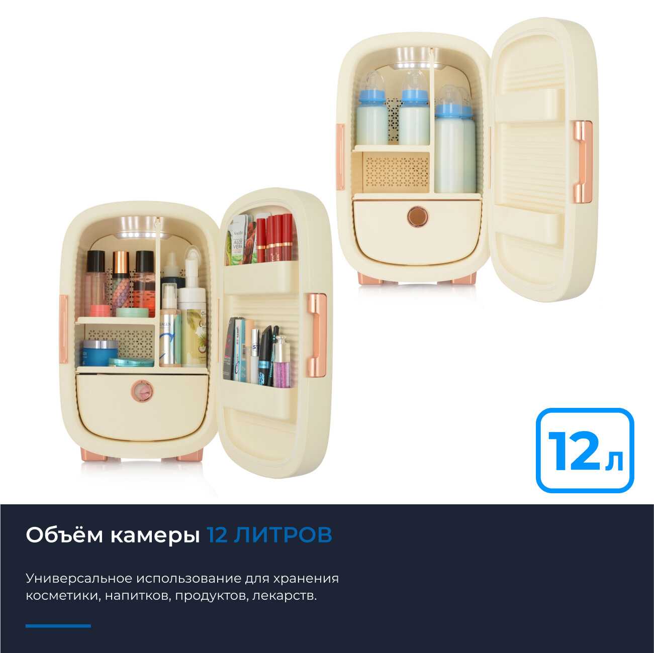 Этот кремовый малыш — просто восторг! Увидела у коллеги на съёмке и на следующий день уже забрала свой. Сюда помещаются все мои баночки: патчи, сыворотки, роллеры — всё охлаждается ровно и бережно. Работает почти бесшумно, держит 10°C стабильно. Подсветка — мягкая, не режет глаза ночью, когда ищу патчи на сонной автоматике.