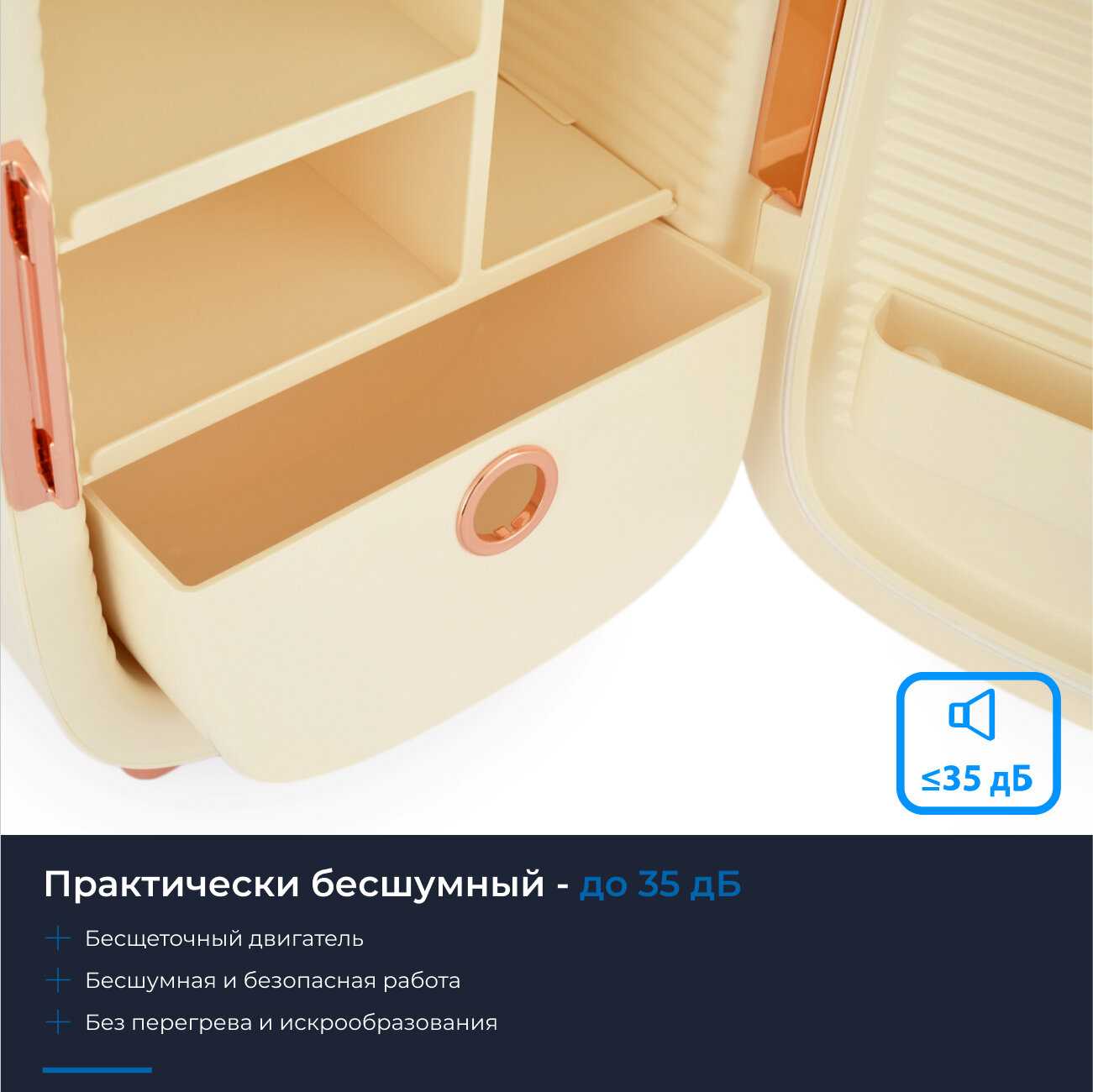 В поисках чего-то компактного и стильного для своей косметики я нашла этот холодильник, и не разочарована! Отлично подходит для хранения дорогих кремов и масок. Кремовый цвет с зеркальной дверцей смотрится очень элегантно. Температурный режим 10°C поддерживает все мои средства в идеальном состоянии. И самое главное — он практически бесшумный!