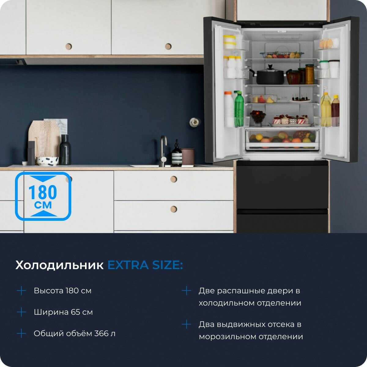 Матовый чёрный цвет смотрится стильно, отпечатков почти не видно. Ни разу не пришлось размораживать, система No Frost делает всё сама. Охлаждает равномерно, запахов нет, температуру держит стабильно. Зона свежести действительно работает: овощи и фрукты долго не вянут. Работает бесшумно, подсветка приятная, не бьёт по глазам. Смотрится солидно, хорошо вписался в интерьер.