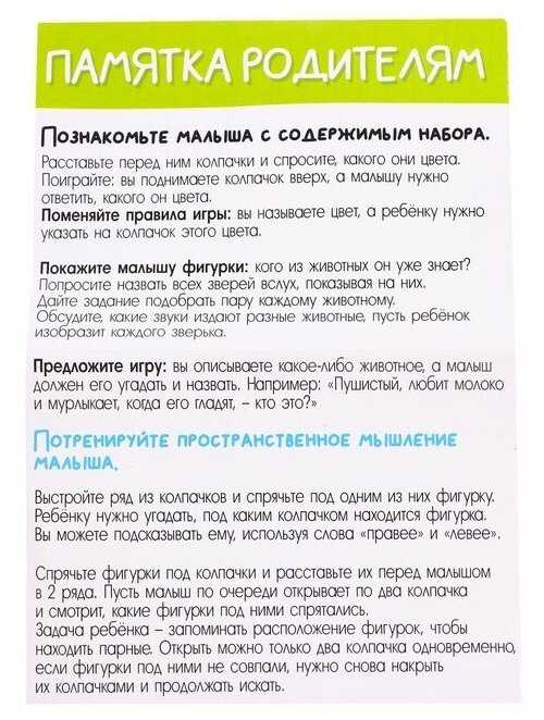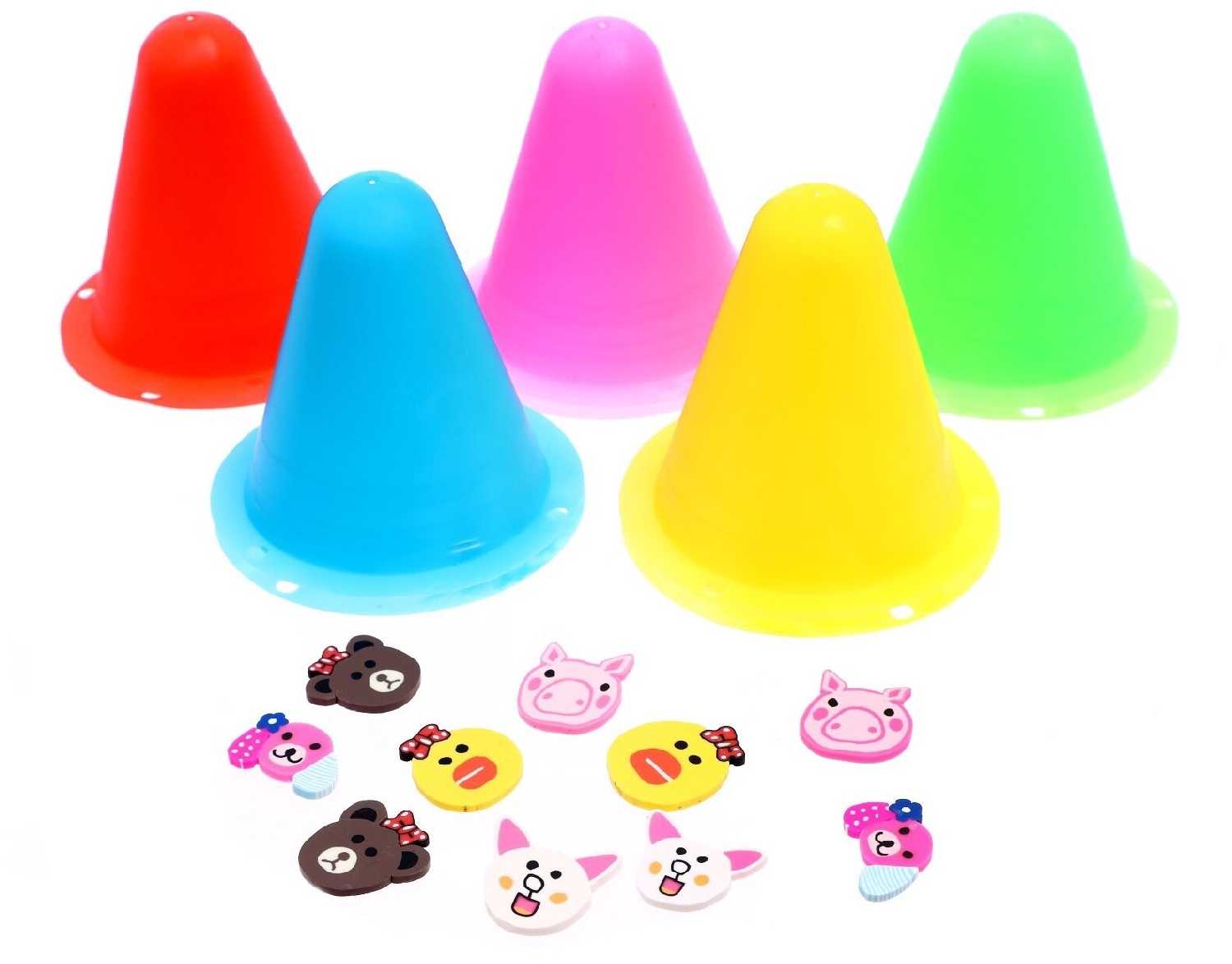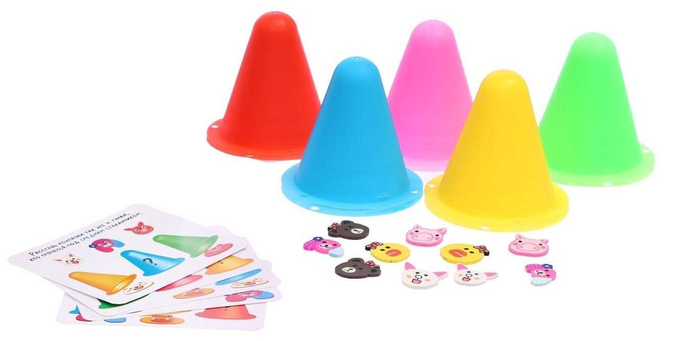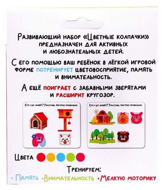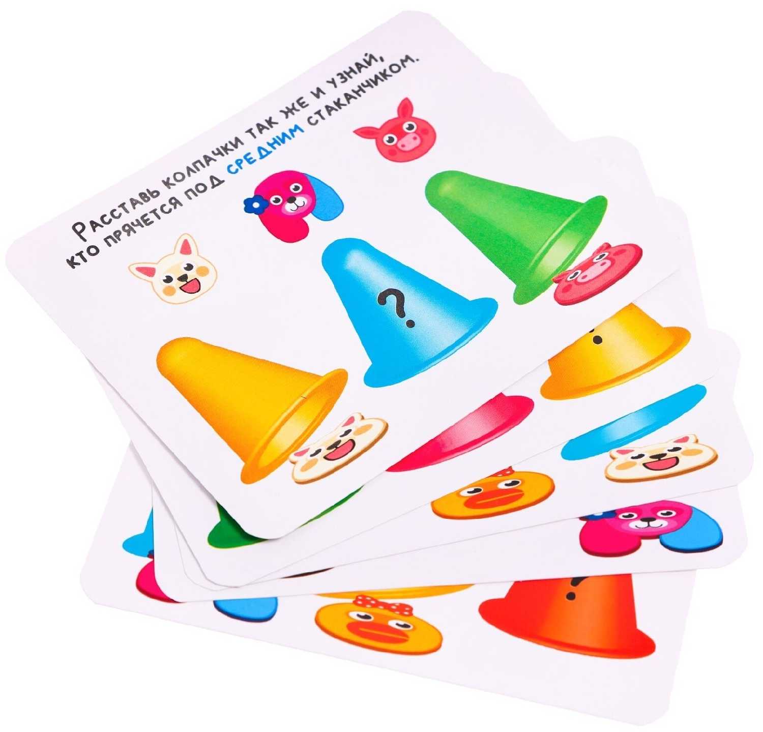 Комплектация : | Колпачки (пластик): 8 × 8 × 8 см. 5 шт, двусторонних карточек (картон): 10 × 8 см 5 шт., фигурки (резиновые): 2, 5 × 2 × 0, 3 см 10 шт. |
