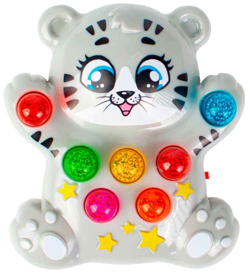- + Яркая , развивающая , музыкальная игрушка.Светящимися кнопками на панеле можно выбрать песенку , стих или звуки животных. Игрушка работает от батареек ( входят в комплект )