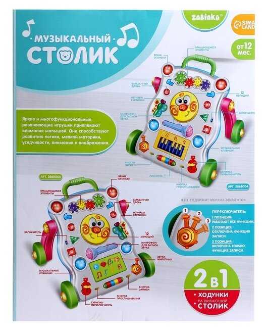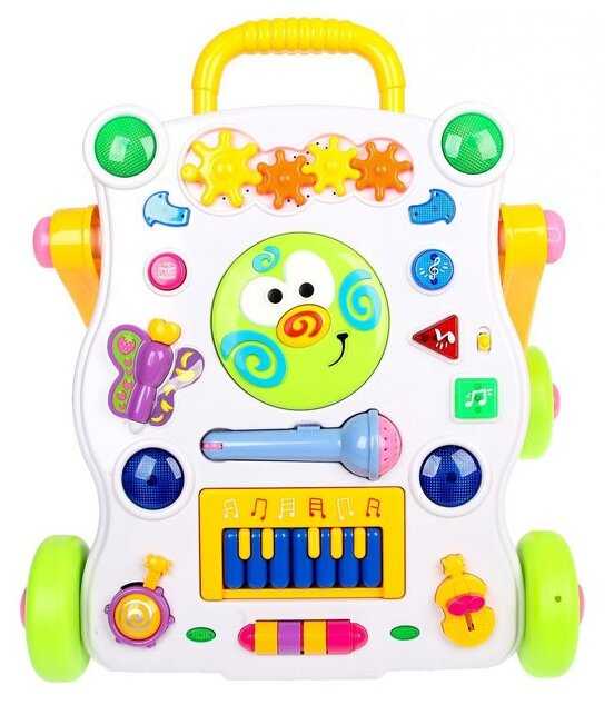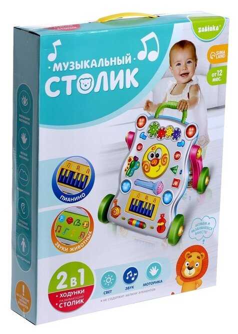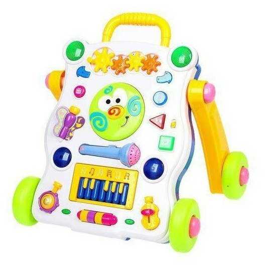 - - Все хлипкое, ножки не фиксируются нормально и когда ребенок опирается на ходунки ножки разъезжаются, громкая на столько, что дочь пугается, звуки по сути одни и те же, клавиши не соответствуют тем, что указан на коробке (например вместо барабанов...