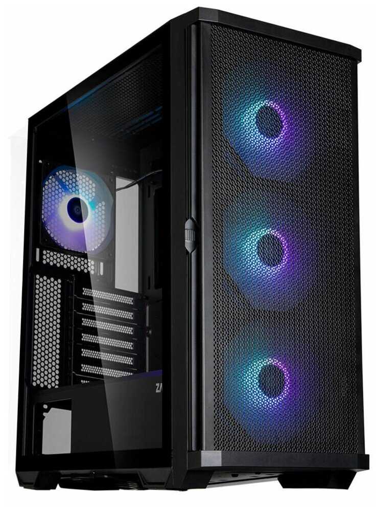 Благодаря перфорированной передней панели, верхней и боковой сеткам, корпус обеспечивает превосходную циркуляцию воздуха. В комплекте поставляются 3 вентилятора 140 мм на вдув спереди и 1 на выдув сзади (120 мм), что в сочетании с возможностью установки до 12 вентиляторов (включая боковые и нижние слоты) создает мощный воздушный поток. Температурные показатели в отзывах описываются как отличные: даже при нагрузке i5-13600KF не превышает 85°C, а RTX 4070 держится в районе 70°C. -