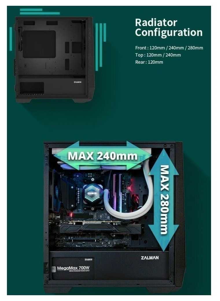 - Возможность установки СЖО с радиатором до 360 мм на переднюю панель.