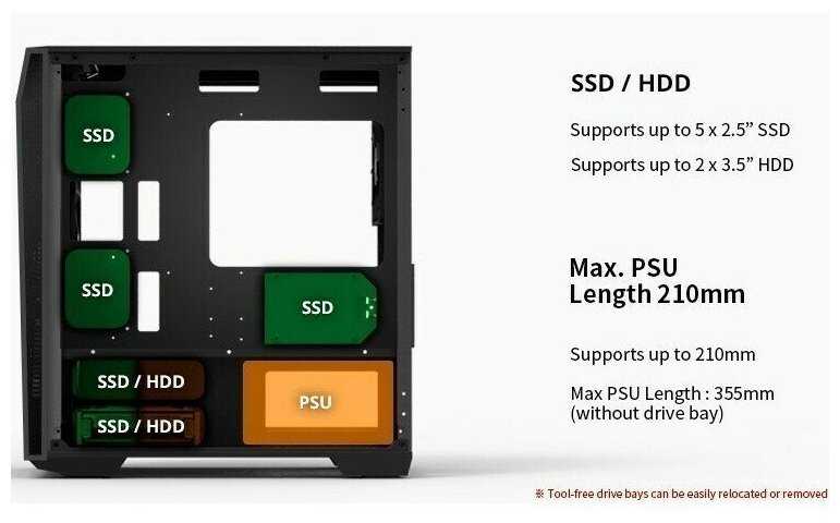 - Отсеки для 2 HDD 3.5" и 3 SSD 2.5" с гибкими креплениями.