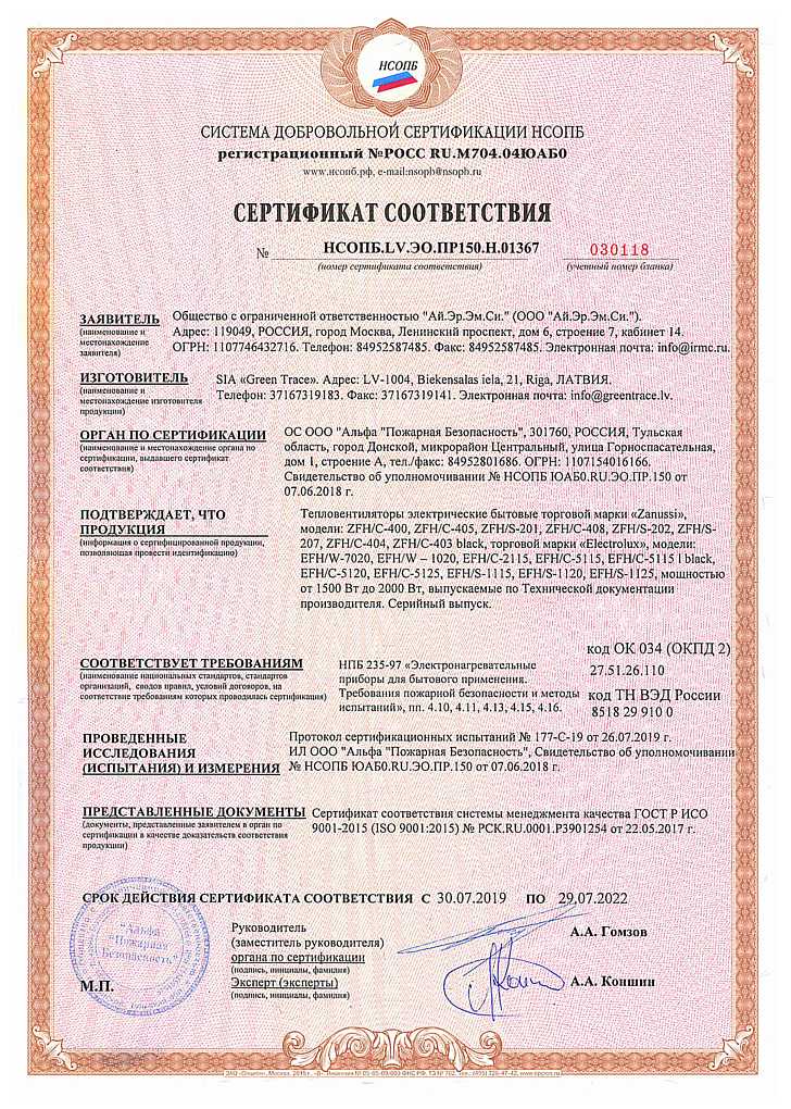 | Дополнительная информация : | Класс защиты: II, Длина кабеля: 12 м, Ступени мощности нагрева кВт: 075, Потребительский класс: Стандарт, Точность установки температуры: Механическая регулировка, Серия: ZFH/C, Сертификат пожаробезопасности, Материал корпуса: Пластик, Тип термостата: Механический, Область применения: Бытовое оборудование (для домашнего использования), Класс пылевлагозащищенности: IPX0, Количество режимов нагрева: 2, Вариант размещения: Вертикальное, Напряжение электропитания В: 220 - 240, Сетевой кабель: Да (с вилкой), Режим вентиляции без нагрева, Материал защитной решетки: Пластик |