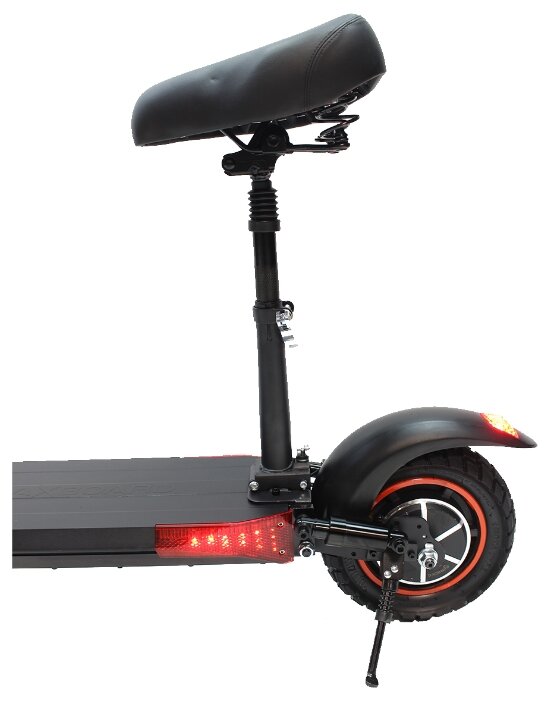 Особенности электросамоката : | дисплей, задний габарит/стоп-сигнал, индикатор заряда, индикатор скорости, ограничитель скорости, передняя фара (фонарь), подсветка, привод задний, сиденье в комплекте |