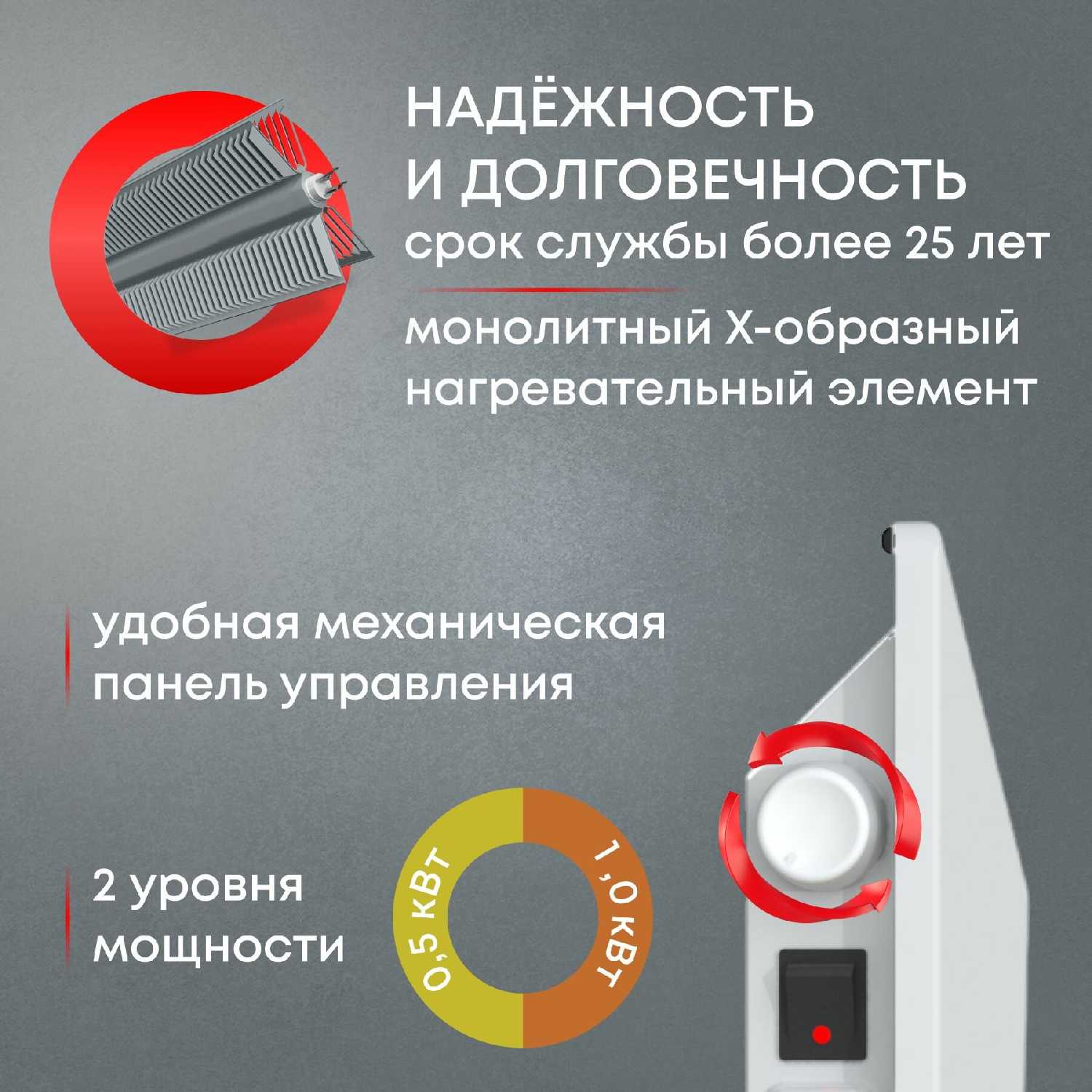 - + Отличный обогреватель. Хорошо распределяет тепло по комнате. Красивый, плоский.