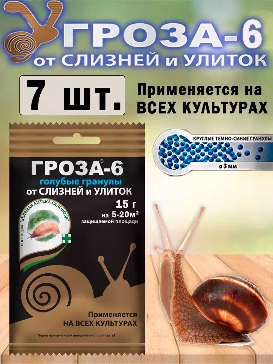 - + Отличное средство от слизняков, с его помощью вывела их с участка, у меня их было сотни под прелой прошлогодней травой, посыпала средство три раза, всё слизни массово умерли. не знаю лучшего средства, чем Гроза-6!