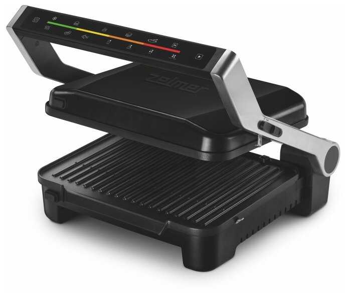 | Особенности : | антипригарное покрытие, контактный гриль, поддон для сбора жира, регулировка высоты верхней панели, решетка, съемные пластины |