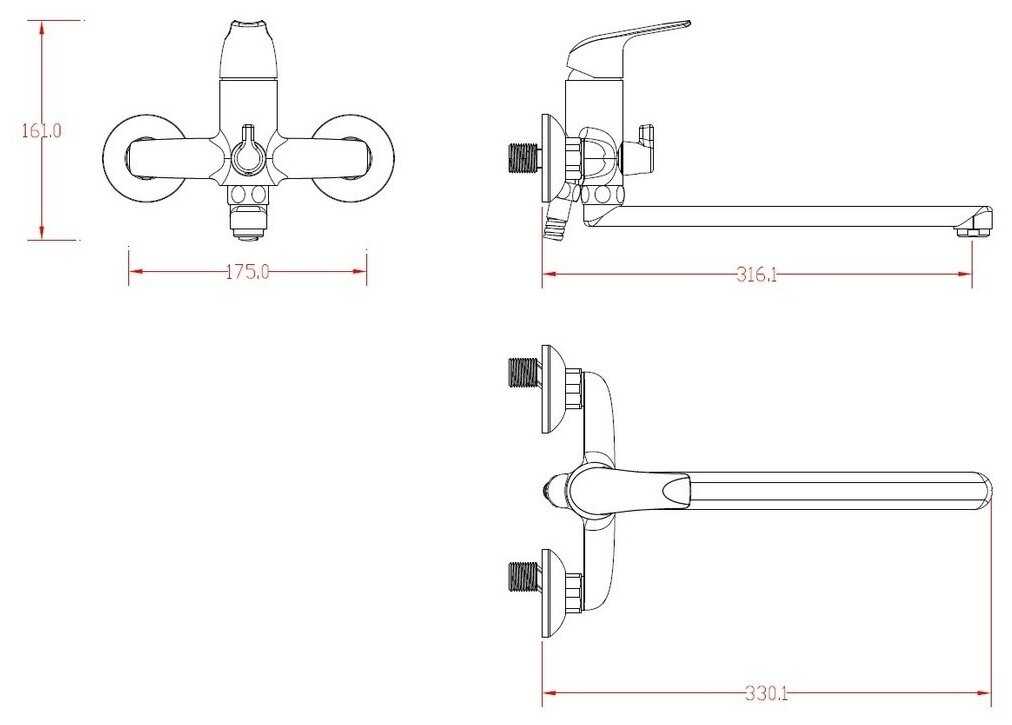 | @Комплектация : | смеситель, эксцентрики, прокладки, декоративные розетки, душевая лейка, держатель для лейки с крепежом, шланг 1, 5 м |