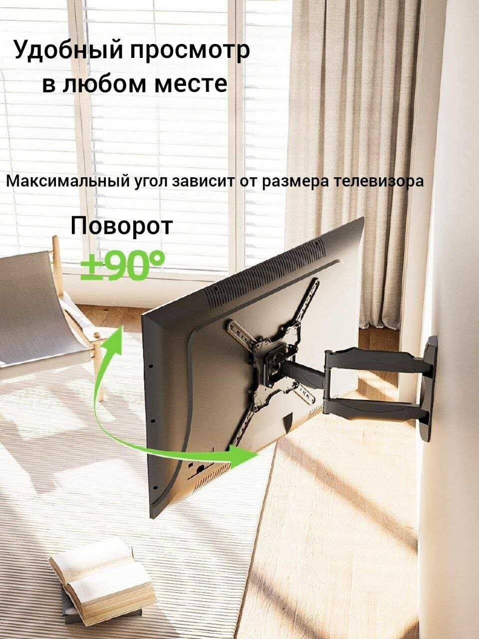 - Обеспечивает поворот телевизора до 45 градусов и более, позволяя оптимально настроить угол обзора для комфортного просмотра.